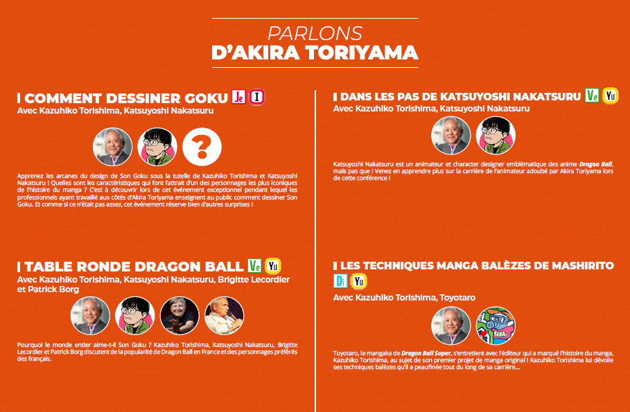En plus des séances de dédicaces, Kazuhiko Torishima, Katsuyoshi Nakatsuru, Toyotaro mais aussi Brigitte Lecordier et Patrick Borg seront présents jeudi, vendredi et/ou dimanche pour plusieurs conférences autour de Toriyama, de Dragon Ball et de Son Goku