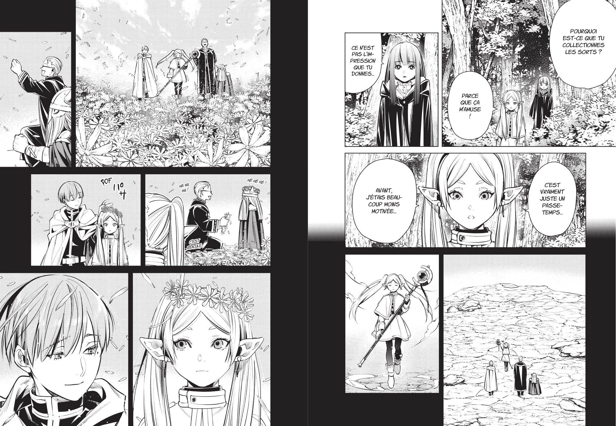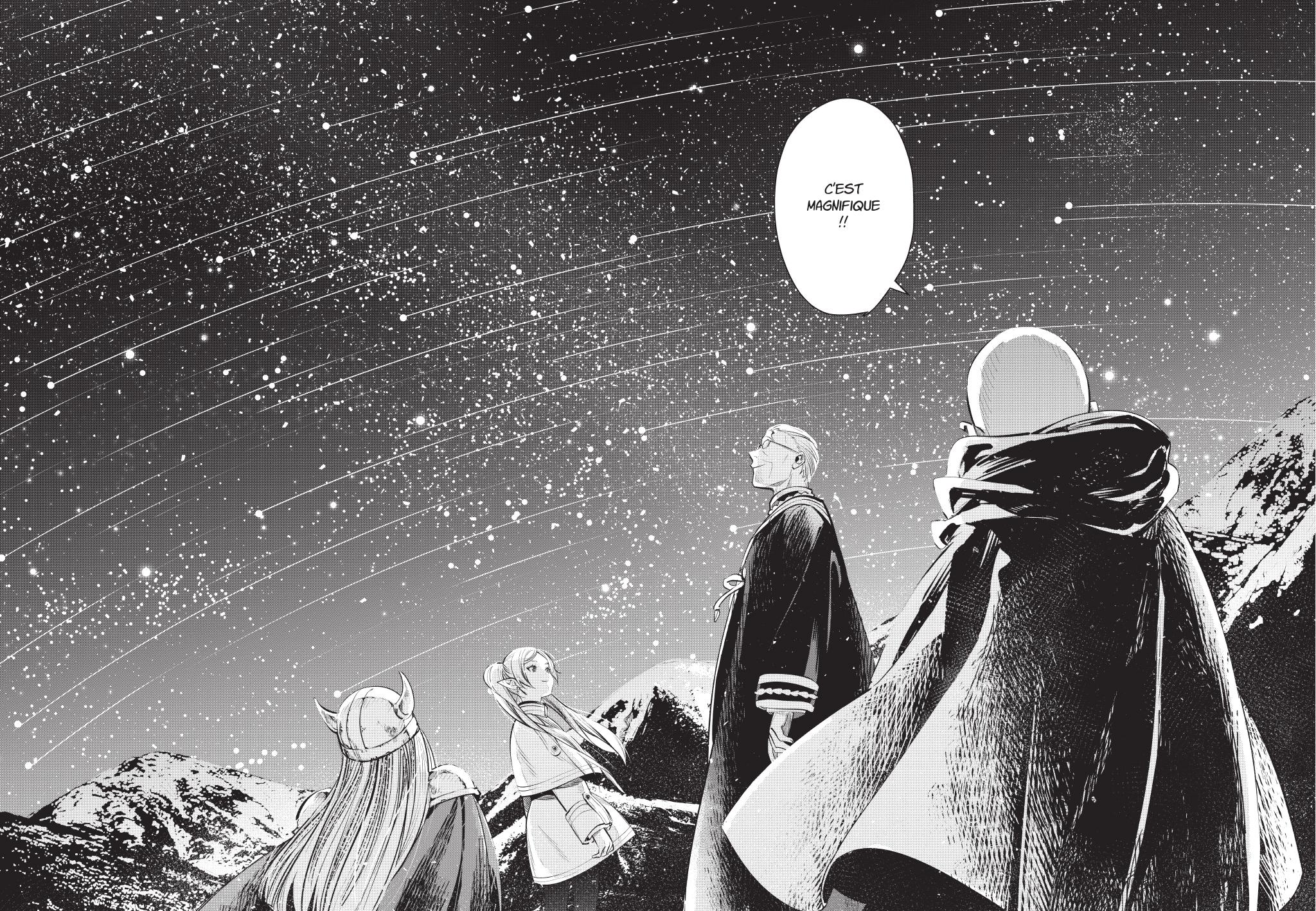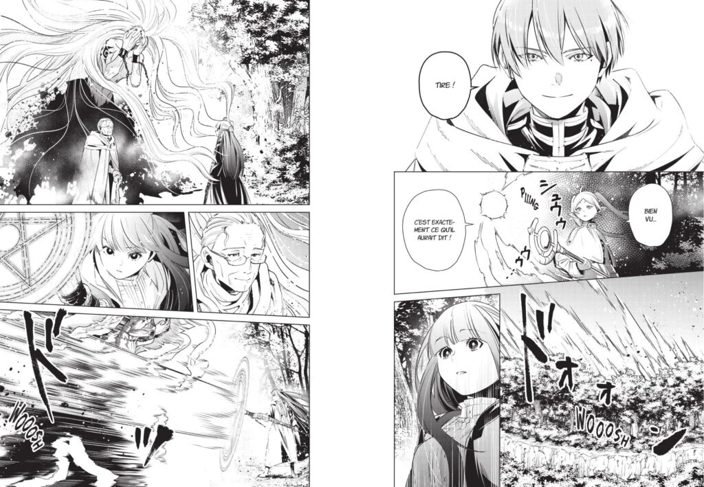 Ce qui surprend dans Frieren, ce n’est pas uniquement le fait qu’il nous offre une autre approche de la fantasy, mais également sa capacité à nous faire réaliser une chose. Antoine de Saint-Exupéry avait raison lorsqu’il disait : « On ne voit bien qu’avec le cœur« . En effet, si en tant que lecteur ou lectrice de fantasy, vous aviez l’habitude des grandes batailles, des dragons et des quêtes interminables, Frieren préfère célébrer les petits gestes. Ces petits détails qui font toute la saveur de la vie : un sort pour faire fleurir un champ de fleurs, une conversation sur le chemin ou un repas partagé avec des amis. Sauf en certains moments, la magie de Frieren n’est jamais spectaculaire. Elle est fonctionnelle, discrète, presque banale. Pourtant, elle apaise l’âme et le cœur.