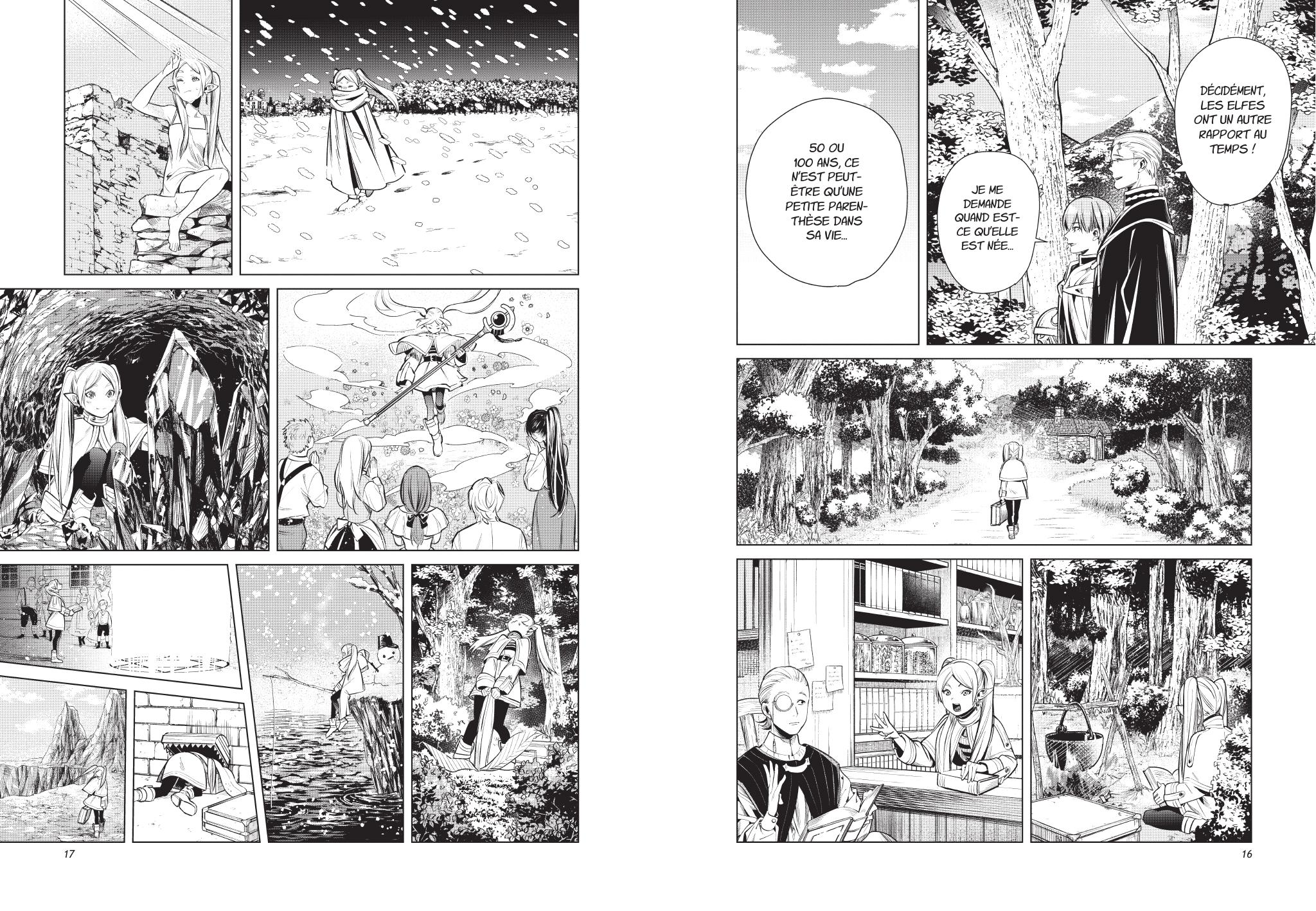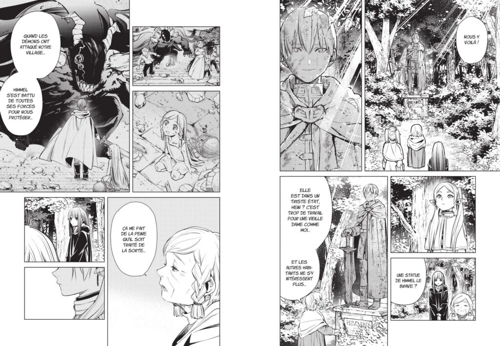 Bien que Frieren puisse nous bouleverser par sa tendresse et sa philosophie du quotidien, le rythme du manga peut également être son plus gros point faible. Car à force de lenteur et de silences, le titre flirte parfois avec une certaine monotonie qui pourrait faire fuir plus d’un lecteur. Le récit se refuse en effet à toute forme d’urgence, bien loin des blockbusters que l’on connait, où tout va toujours très vite. Les enjeux peuvent ne pas être compris, les arcs narratifs nous semblaient extrêmement longs, voire presque étouffés par cette volonté de rester dans une certaine retenue. Dans un certain sens, on pourrait même dire que Frieren sacrifie volontairement la tension dramatique au profit d’une atmosphère douce-amère. Ce faisant, la lecture devient plus exigeante pour un lectorat peu habitué à ce genre d’approche.