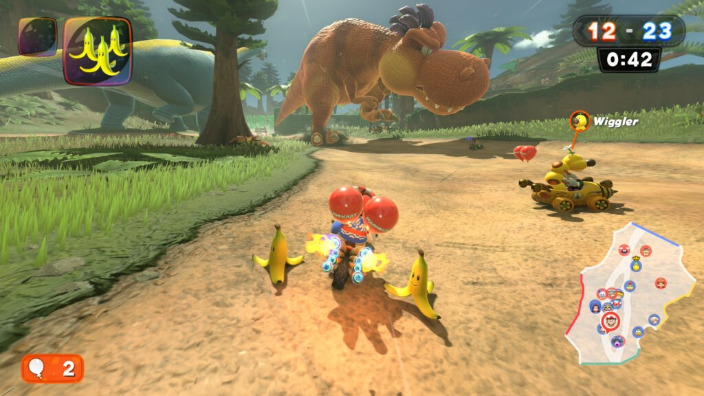 On peut néanmoins noter que plusieurs absents manquent à l’appel, à commencer par le mode 200cc. On peut aussi trouver que seulement 8 coupes c’est assez léger comparé aux 32 présentes sur la fin de vie de Mario Kart 8 Deluxe. Aussi, certains personnages – Donkey Kong et Pauline pour ne citer qu’eux – ne disposent que d’un ou deux costumes alternatifs. On est cela dit en droit de penser que plus seront ajoutés dans les mois à venir (la sortie de Donkey Kong Bananza en juillet 2025 serait une bonne occasion puisqu’il mettra en scène le primate ainsi qu’une version de la demoiselle).