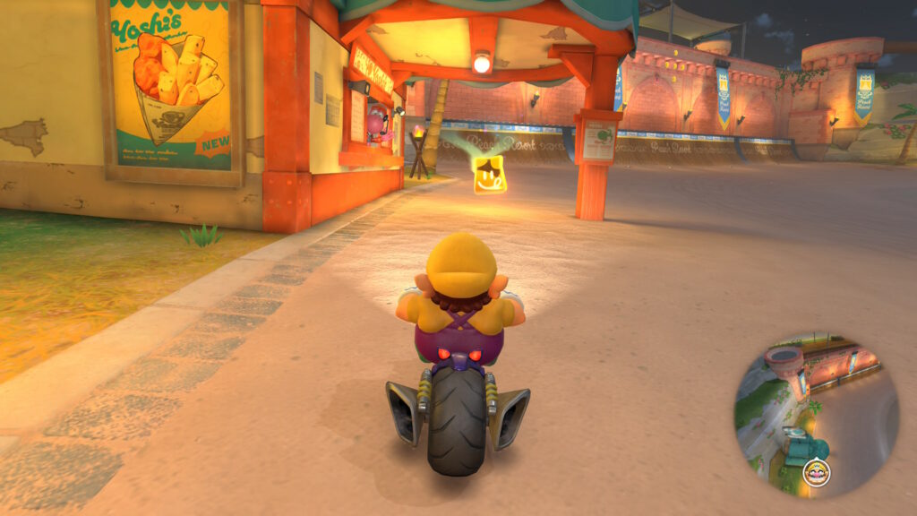 À l’image du titre du jeu, nos personnages jouent les touristes à travers le monde et changent de tenue pour s’adapter à leur environnement. En cours de course, il est parfois possible de faire une petite pause gourmande sur le bord de la piste. Par exemple, à certains endroits, un stand Yoshi’s Diner peut apparaître. Un doggy bag jaune contenant un plat inspiré de la spécialité culinaire du circuit – comme un burger, des brochettes, des sushis ou encore des chips, vous permettra de changer de tenue selon l’ambiance du décor.