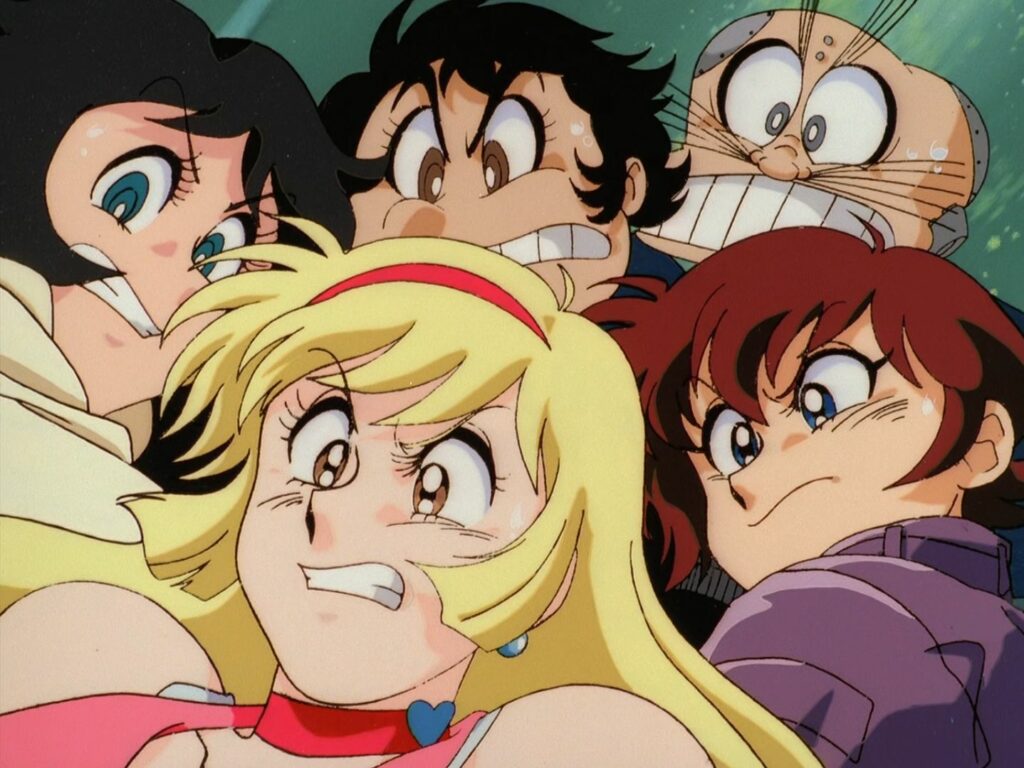 Le chara-design, lui-même extrêmement réussi, parvient à mixer la rondeur mignonne et délirante des personnages de Nagai, avec une dimension plus élancée, adulte et musclée, très 90. L’animation en elle-même est de belle qualité, du niveau des bonnes OAV de l’époque justement. On est au dessus d’une série standard, sans atteindre non plus le niveau d’un long métrage de cinéma, pour un résultat des plus plaisants, fleurant bon le savoir-faire des animateurs à l’ancienne, notamment lors des multiples séquences de transformations et de combats.