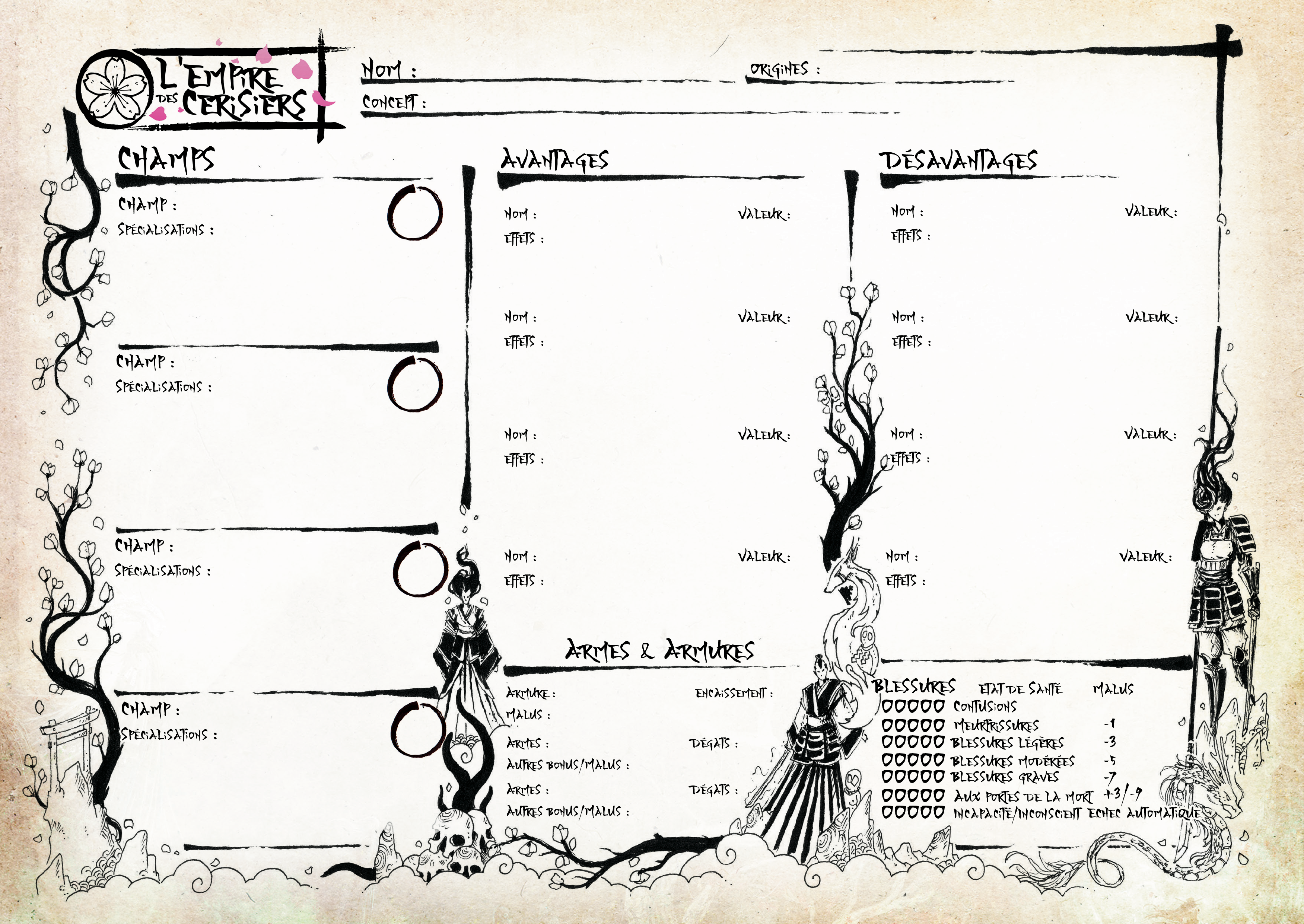 Dans l’Empire des Cerisiers, votre personnage est défini par plusieurs choses : un Concept Initial (son identité), des Champs (ce qu’il fait dans la vie, bushi, pirate, marchand, ou autre), des Spécialisations (ce dans quoi votre personnage est doué(e)), des Avantages et Désavantages (des points forts et des points faibles), une Voie (ce qui définit la philosophie et la morale de votre personnage) et un Aspect (qui dépend de la Voie que votre personnage suit). Ces deux derniers points sont spécifiques à l’Empire des Cerisiers, et peuvent être un peu complexes à appréhender. Ils sont cependant expliqués en détail dans la partie dédiée à la création de personnage.