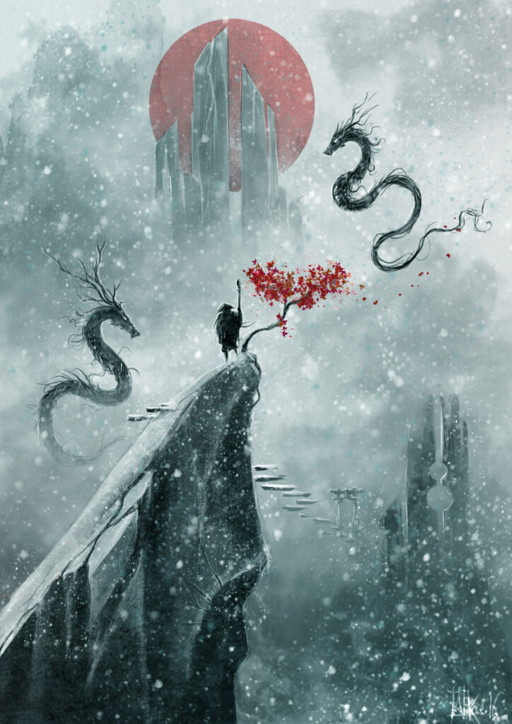La société des Sakurajin, les habitants de l’Empire des Cerisiers reprends pas mal d’éléments de la société du Japon féodal. Bien qu’assez proche de la réalité historique, cela sert avant tout à poser un cadre au récit, et des libertés ont été prises afin de développer son propre univers. Ici, point de Shogun par exemple, l’Empereur conserve son autorité, et toute la structure hiérarchique de l’Empire est basée autour de lui et de sa Cour. Les samurai et les Daimyo sont également de la partie, et de nombreux clans, qu’ils soient aristocratiques ou guerriers, sont présents. La religion principale est le shintoïsme, qui est peu ou prou le même que notre réalité. À ce dernier s’est ajouté la Voie des Huit Roi-Dragons. Cette Voie s’inspire de principes et de concepts véhiculés par le bouddhisme et le confucianisme.