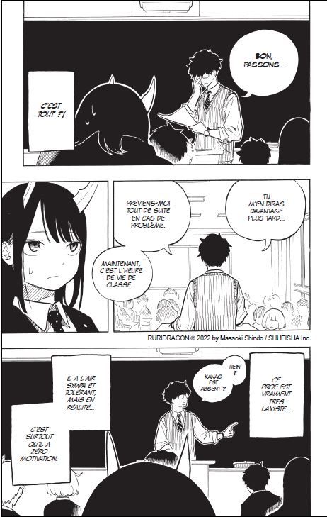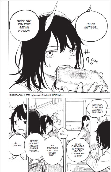 À travers les yeux de Ruri, une lycéenne mi-humaine mi-dragon, on découvre un quotidien chamboulé non par une apocalypse ou une guerre, mais par une transformation personnelle, intime, presque silencieuse. Pas de cris, pas de grandes batailles. Juste une adolescente qui apprend à vivre avec une part d’elle-même qu’elle ne comprend pas encore, une part qui fait peur, qui fascine aussi, et qui attire les regards. Et dans cette belle métaphore de la différence, chacun et chacune peut se reconnaître, que cela touche le genre, la couleur de peau, la sexualité, l’handicap, etc.