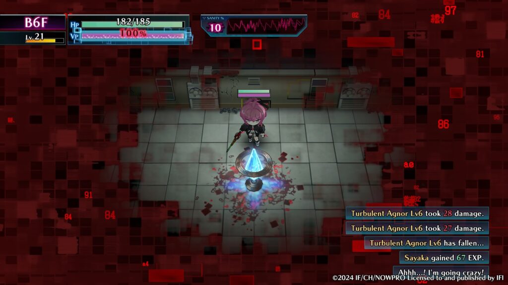 Celle-ci descend régulièrement au fil des pas effectués, des attaques portées ou subies, ou parfois même des pièges affreux dans lesquels on tombe (perte de vie, de santé mentale, téléportation dans salle plus loin, etc., et ces pièges ne peuvent être détectés que par des objets ou en portant des coups dans le vide devant soi). Il est possible de « passer le temps » en appuyant sur deux touches simultanément : cela fait descendre la santé mentale mais permet de regagner de la vie. Les monstres, s’ils se trouvent dans les parages, se déplaceront en même temps aussi, alors attention à utiliser cette fonction au bon moment uniquement. Sayaka regagne naturellement de l’énergie au fil de ses pas, mais il n’y a parfois pas suffisamment de distance entre deux opposants pour revenir au top en cas de grand danger… bref, la santé mentale… ne l’oublions surtout pas…
