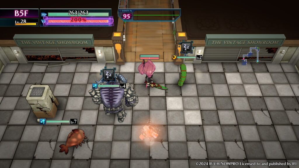 Vous pensiez que c’était tout ? Eh bien non. Comme si ce n’était pas déjà assez compliqué, certains donjons sont occupés par des « Glitch Girls ». Ce sont les héroïnes à sauver dans une version buggée, corrompue, et qui ne se gêneront pas pour vous attaquer ou bloquer le chemin (forçant à faire demi-tour et un détour vers la sortie, incluant donc forcément plus de combats et plus de santé mentale à surveiller). Elles sont extrêmement coriaces et il est chaudement conseillé de simplement les fuir et tracer votre route, ce surtout si vous êtes en train d’escorter quelqu’un. D’autant plus que les vaincre vous octroiera un joli succès ou trophée pour une première victoire sur elles et… c’est tout. Elles reviendront à l’étage suivant…