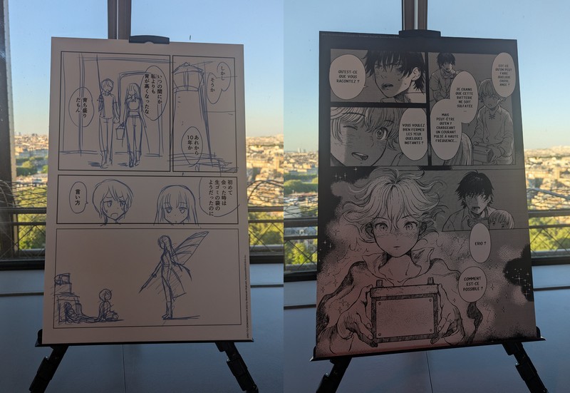 Comme évoqué dans l’introduction, Mangetsu a donc mis les petits plats dans les grands lors de la soirée de présentation du manga à la presse, libraires et autres acteurs du milieu. C’est au premier étage de la Tour Eiffel que les personnes présentes ont pu profiter d’une interview en direct des deux auteurs, mais aussi d’une belle mise en valeur de différents storyboards, planches et des illustrations.