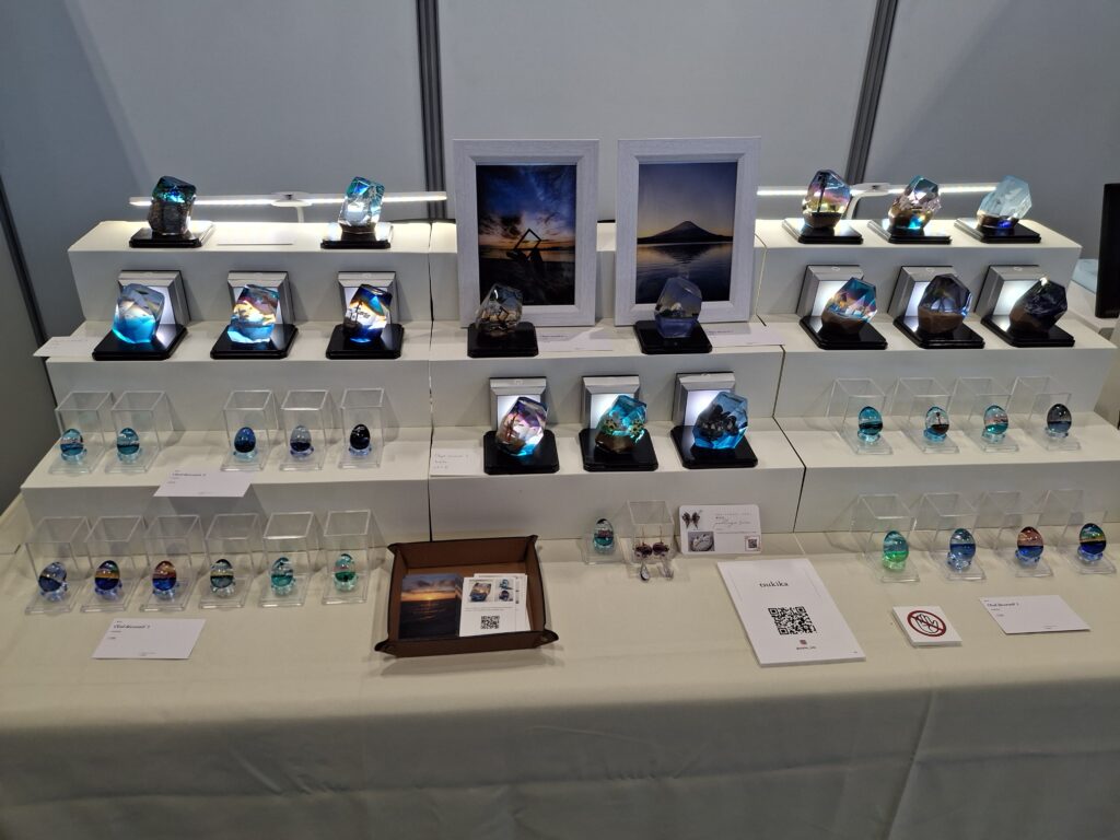 Puisant dans ses souvenirs de voyage, l’artisane de Tsukika reproduit notamment la beauté des plages d’Okinawa dans des œufs de 3 cm sur 2,5 cm ou des cristaux de 7 cm à multiples facettes en résine. Durant la pandémie de Covid-19, l’artiste autodidacte s’est formée en regardant des tutoriels sur YouTube. Chaque création est le fruit de plusieurs jours de travail : il faut attendre qu’une couche de résine soit sèche avant de pouvoir couler une nouvelle couche. Le secret pour reproduire les nuages : mettre en poudre de la gomme. Bluffant de réalisme !