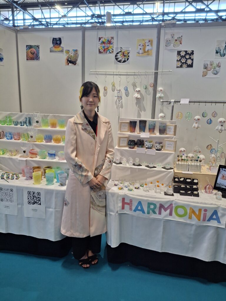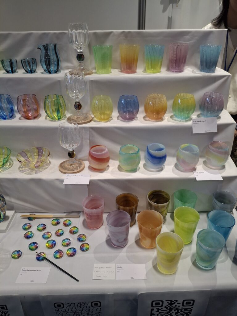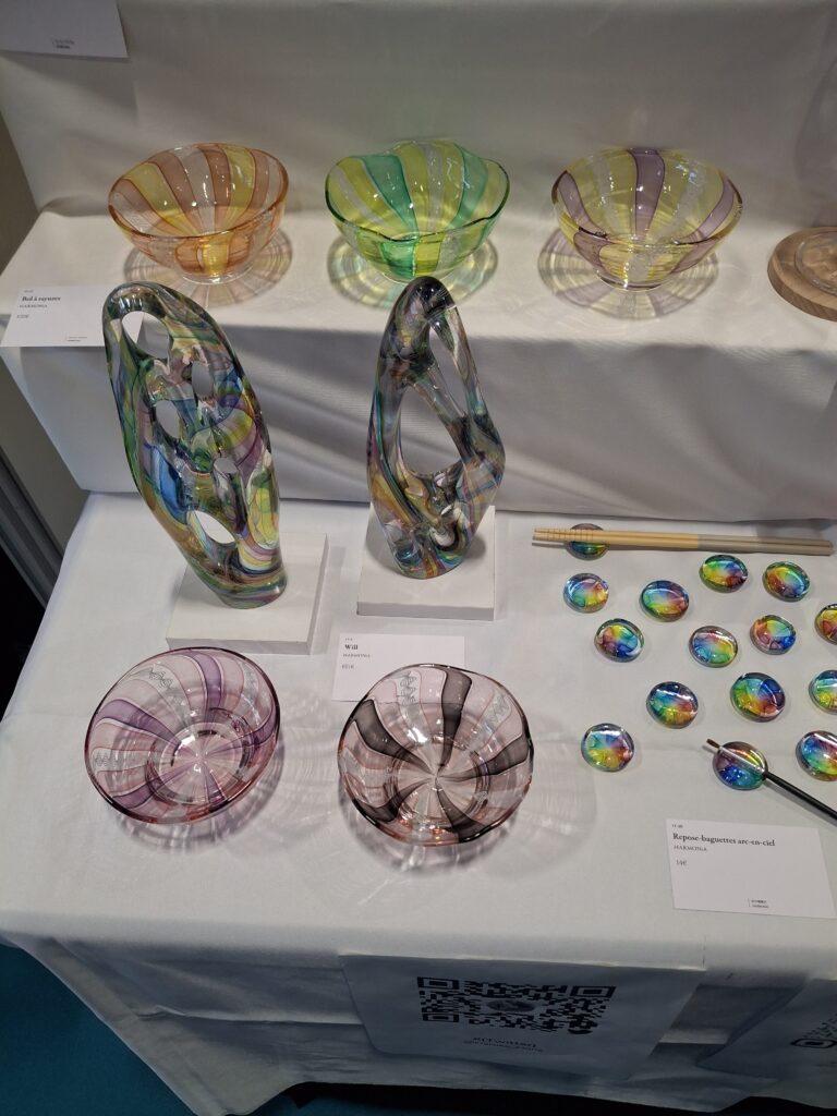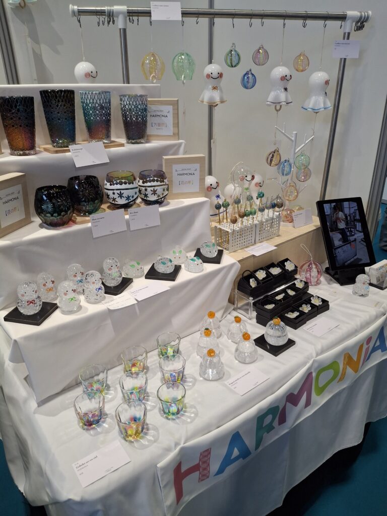 L’artisane verrier Haruka Horie qui a 12 années d’expérience dans la verrerie crée diverses pièces très colorées comme marque de fabrique. En plus de la vaisselle de table multicolore, la créatrice utilise sa maîtrise du verre et ses 3 techniques pour façonner des éléments décoratifs comme des carillons à vent (fûrin), symbole de l’été japonais aux côtés du chant des cigales, ou encore des teru teru bôzu pour chasser la pluie si l’on chante la comptine paraît-il. Sur le stand d’HARMONiA, on est reparti avec un beau verre à eau qu’on utilisera sûrement en pot décoratif.