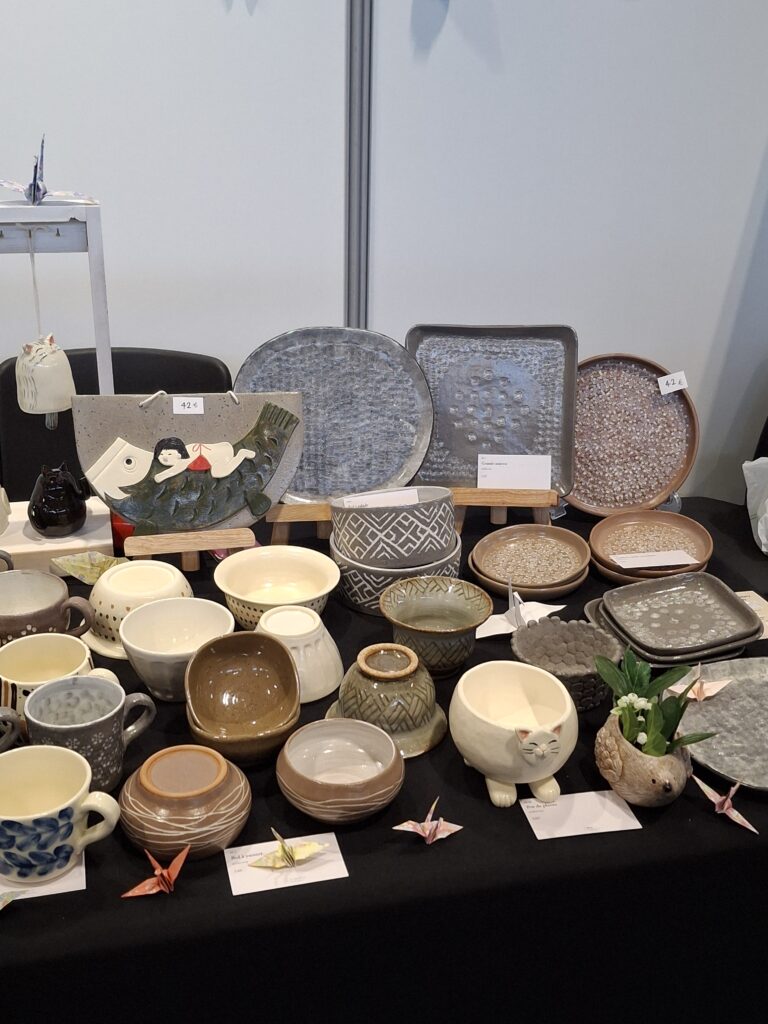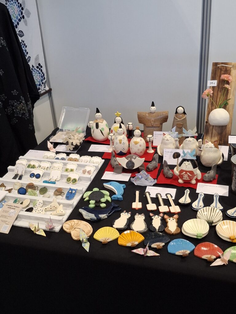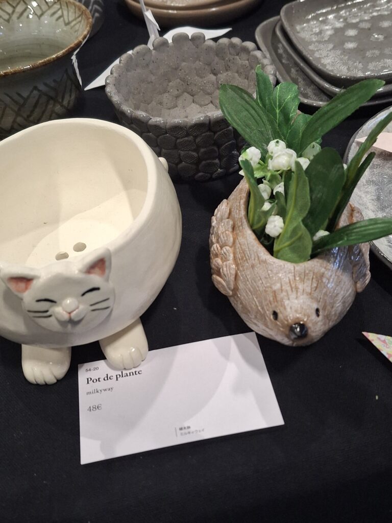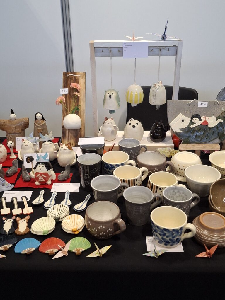 En grand fan de céramique, impossible de ne pas faire une halte sur le stand de Milkyway qui proposait une sélection d’assiettes, de tasses, de repose-baguettes mais aussi des éléments de décoration pour les fêtes japonaises du Hina Matsuri (fête des filles) ou Kodomo no Hi (fête des enfants). L’artisane aimant la nature et les chats réalise des maneki-neko et divers petits objets du quotidien comme des fûrin en forme de chat et d’oiseau par exemple ainsi que des pots de fleurs mignons en forme de chat (oui, l’artiste aime beaucoup les chats et le jardinage !) ou d’hérisson. Un véritable voyage au Japon !