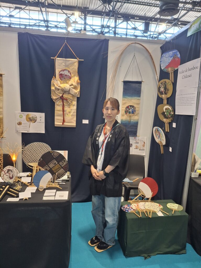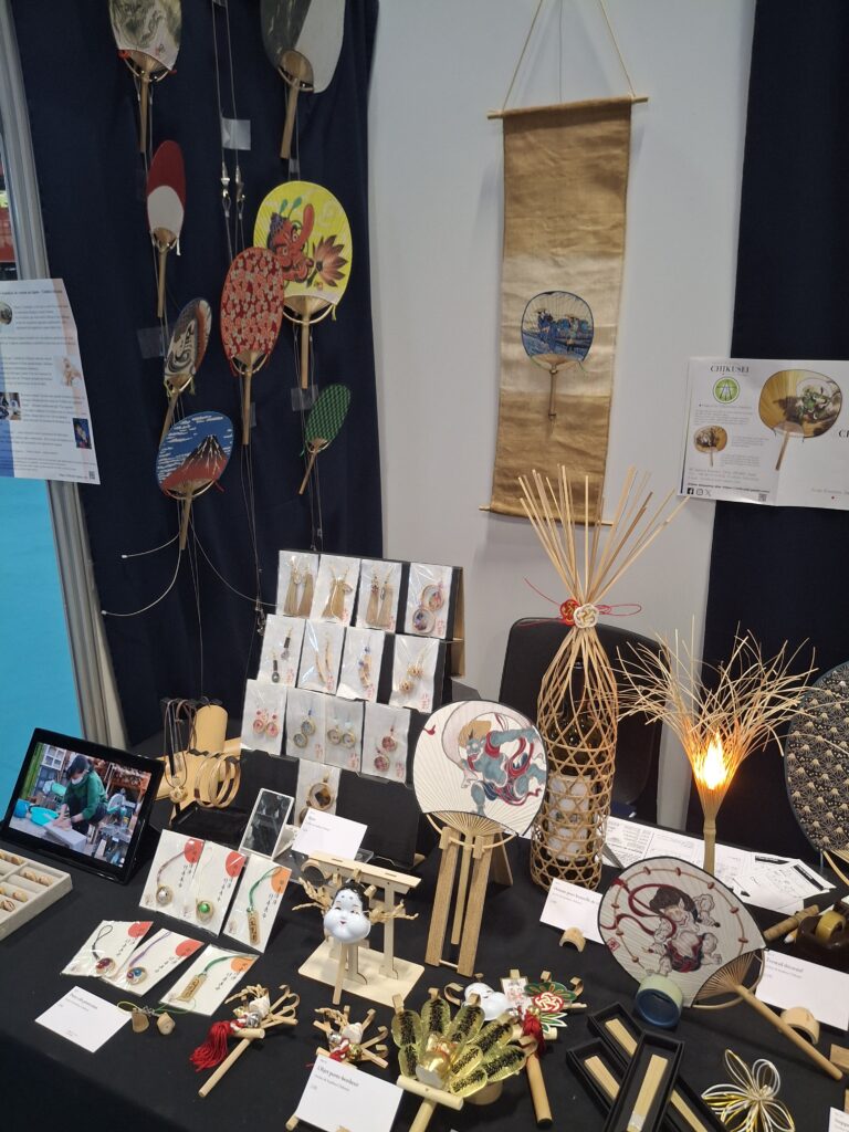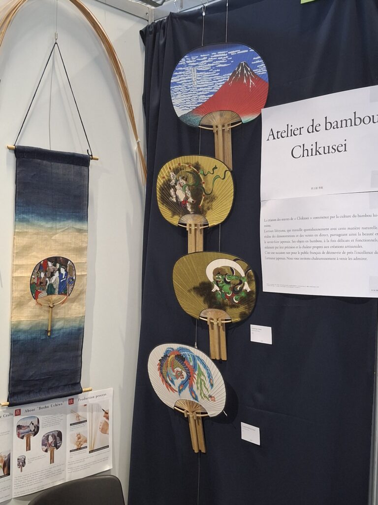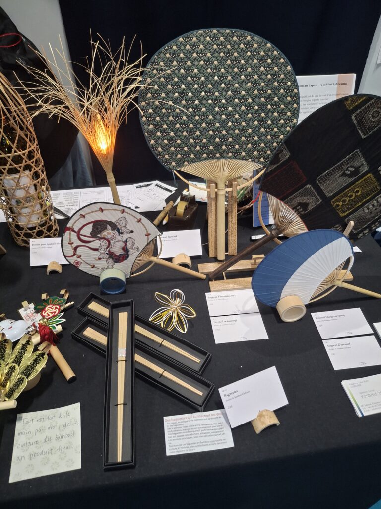 On commence notre tour des artisans avec l’atelier de bambou Chikusei qui proposait des démonstrations de fabrication de Bôshû Uchiwa, éventails japonais en bambou. Sur le stand, il y avait du choix et il était presque impossible de ne pas craquer pour un modèle. Aux côtés des éventails, des râteaux porte-bonheur en bambou ainsi que des accessoires étaient en vente. L’artisane Ishiyama choisit la matière première, dans la bambouseraie de son voisin et a plaisir à transformer le bambou pour créer par exemple de nouveaux objets comme des lampes ou un panier pour emballer une bouteille de vin à offrir dans la pure tradition japonaise des omiyage.