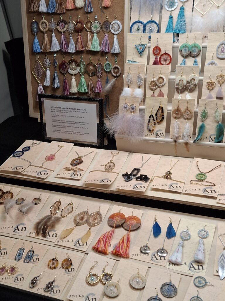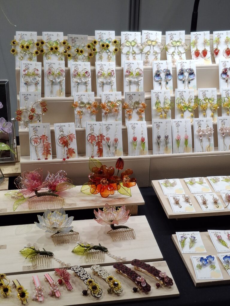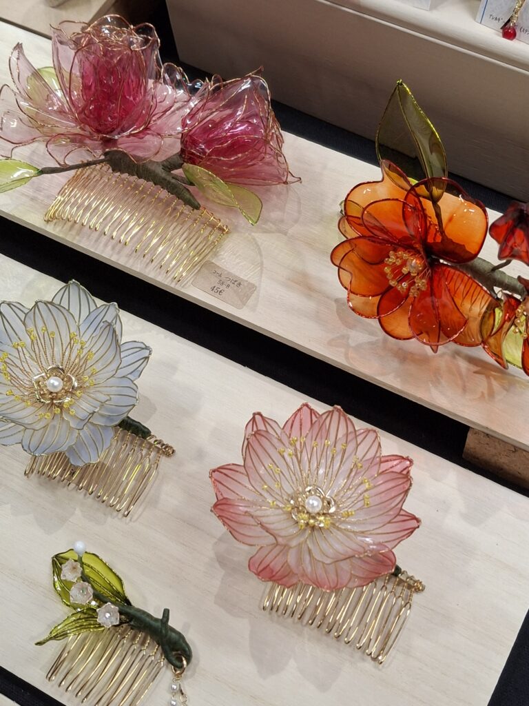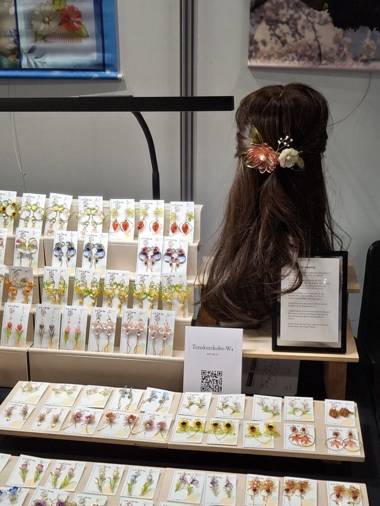 Sur le stand de Tezukurikobo-Wa, il y avait des accessoires (pinces à cheveux et boucles d’oreilles) fabriqués avec de fins fils métalliques et de la résine représentant de jolies fleurs des 4 saisons. L’artisane était fière de présenter aussi les créations de son fils en situation de handicap qui a son propre univers, les porte-bonheur et attrape-rêves. Comme dévoilé dans le compte-rendu de l’équipe JDJ à Japan Expo, j’ai d’ailleurs craqué pour une pince à cheveux rose pour offrir à ma mère.