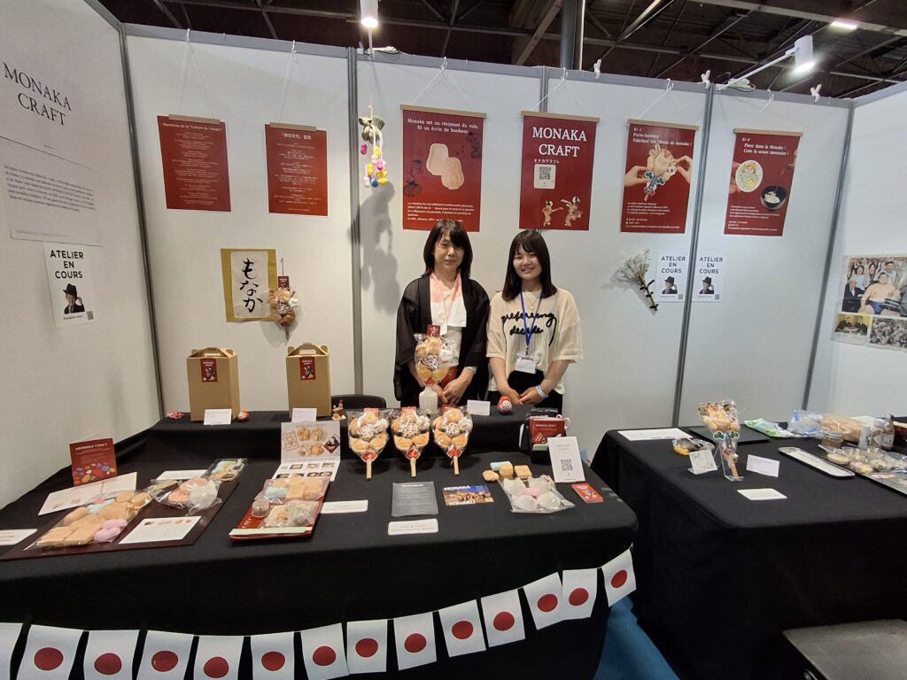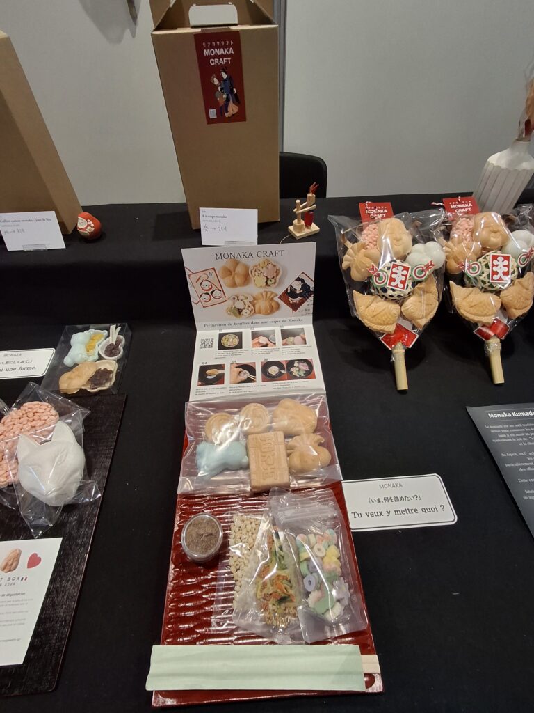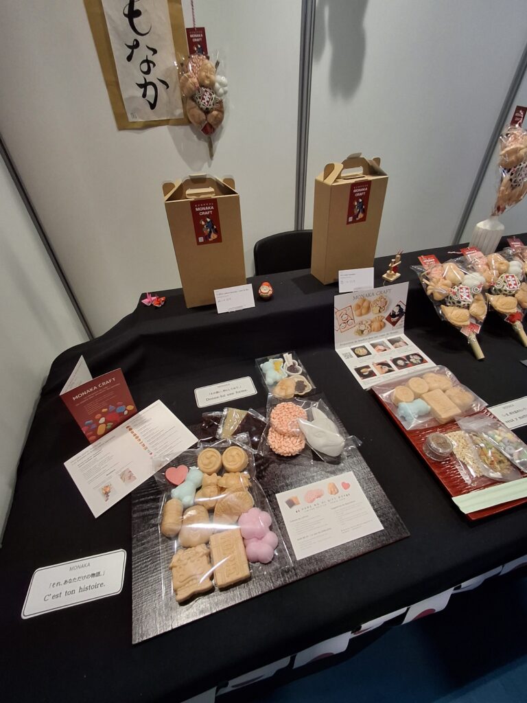 Sur le stand de Monaka Craft, c’était l’occasion de découvrir un porte-bonheur japonais (engimono) encore peu connu en France : le monaka. Il s’agit de fines et légères gaufrettes à base de farine de riz fourrées à la pâte d’azuki (an) en général. Avec la multitude de souhaits possibles, la pâtisserie japonaise prend une forme particulière : la dorade (tai) pour la chance ; le tambour taiko pour la joie et la fête ; le visage d’Okame, la déesse shintô de la gaieté et de la bonne humeur pour le bonheur en famille ; le renard kitsune pour les bonnes récoltes ; le maneki-neko pour le succès commercial ; l’ours (kuma), symbole de force pour protéger sa famille et un accouchement en douceur…