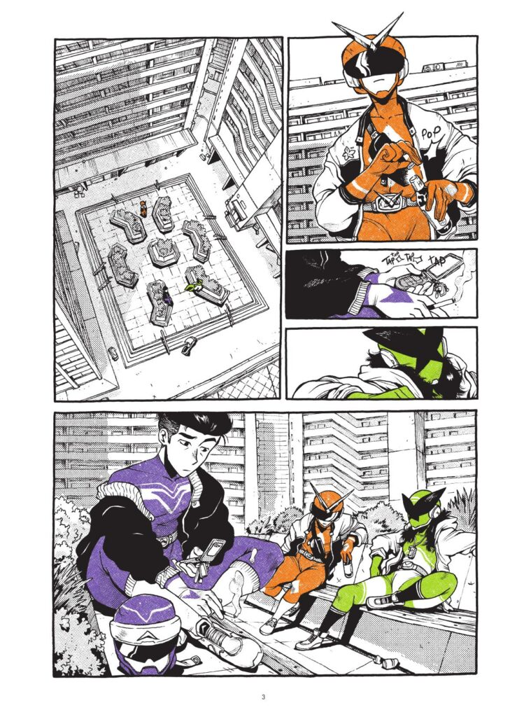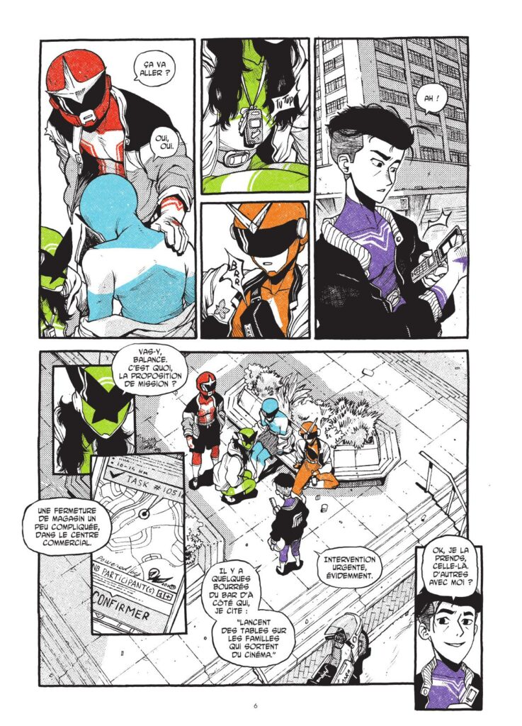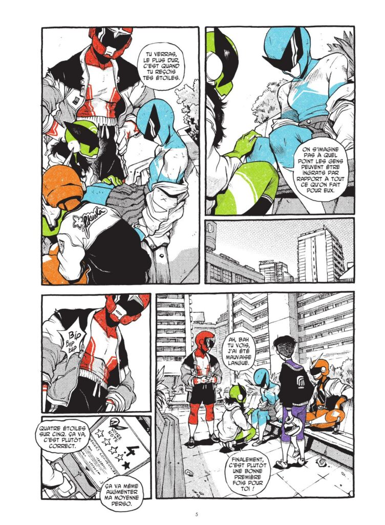 MB : Effectivement. Déjà, nous avons beaucoup discuté entre nous. Il s’agit d’un groupe de vingtenaires et on essaie de se remémorer nos 20 ans, mais aussi quelles étaient nos aspirations, comment on se projetait, quelles étaient les galères, les envies. Et ça a beaucoup construit les cinq personnages principaux, puisque finalement il y a un peu de nous en chacun d’entre eux. L’idée, c’était aussi de montrer comment on projetait le monde. Nous, on était à une époque où on ne parlait pas encore de dérèglement climatique, ou en tout cas beaucoup moins. Le monde était plus stable économiquement et politiquement parlant. Et nous, on a vécu ça, mais on était aussi dans un moment de bascule. Et c’est un peu ce que vivent nos personnages principaux qui sont en train de se chercher, qui ont les modèles de leurs parents et qui en même temps voient que le monde dans lequel ils vivent est un peu différent et un peu plus galère et un peu plus anxiogène. Finalement, il y a beaucoup de nous dans ces personnages là. Et après effectivement, dans le genre du sentai, il y a des codes à respecter. Il y a un qui est plus évident que les autres que l’on a respecté : il n’y a pas quatre personnages, car au Japon le chiffre 4 porte malheur. Pour autant, on a trois personnages féminins et deux personnages masculins afin d’offrir une narration un peu moderne. Alors que traditionnellement, il n’y a qu’un ou deux personnages féminins, mais on s’est dit que ça ne posait pas de problème que les personnages féminins soient majoritaires. D’autant plus qu’on s’est aperçu qu’on avait plus de choses à raconter au travers de ces personnages féminins, à contrario des personnages masculins qui sont un peu monolithiques (NDLR : qui sont un peu rigides), en tout cas dans ce premier tome, dans leurs objectifs.