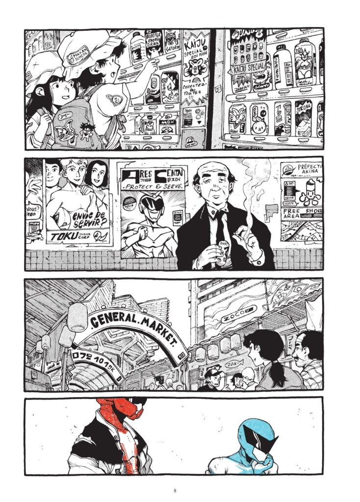 GS : Le tokusatsu est très codifié et effectivement, il existe déjà des réinventions, des oeuvres en continuité et des pures satires. Moi l’approche que j’en ai eu, du moins graphiquement, et puis après dans l’atmosphère du récit, c’est que je ne suis pas forcément un grand fan de tokusatsu. Par contre, je sais que ça a vraiment parsemé ma culture, que ce soit dans les films, des bouts de séries que j’ai vus… Donc j’y suis allé avec une approche où je n’étais pas forcément un fan de première heure, donc ça m’a permis de m’approprier le sujet de manière assez fraîche. Car lorsqu’on est super fan d’un univers, c’est hyper dur d’être vraiment dans l’hommage. Des fois, tu peux être trop dans l’hommage. Donc le fait d’avoir un peu de distance avec le sujet a fait que je me suis vraiment approprié le truc et finalement, même si le tokusatsu est codifié, il est aussi assez libre. On voit toute la diversité des créations qui sont autour du tokusatsu, il y a de tout. Donc il y avait vraiment cette approche de se l’approprier comme ça, avec cette distance. Et pour le coup, par contre, d’apporter toujours un petit d’hommage en étant un peu respectueux de toute cette histoire. On a par exemple cité des petits noms qui sont un peu des petits easter egg pour les fans. Mais on a jamais voulu faire une satire pure et dure, parce que je ne pense pas que ce soit notre approche de nous moquer de ce qui nous plait. Même si des fois la satire peut aussi être bienveillante, mais nous le ton du récit est plutôt sérieux donc ça n’allait pas avec. Donc voilà, je pense que c’est que ces 2 façons de faire qui font qu’on s’est approprié le tokusatsu de cette manière-là.
