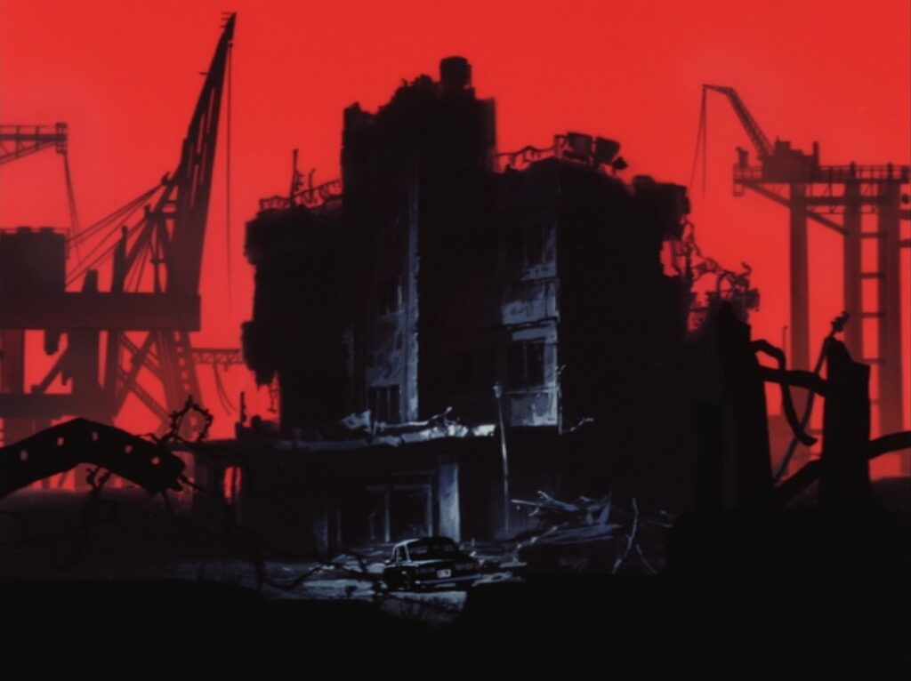 Le look si typé du film en lui-même, presque en noir et bleu avec quelques touches de rouges, est autant dû aux limitations techniques et budgétaires (sensibilité et fiabilité de la pellicule à l’époque, difficulté à faire ressortir les nuances voulues, faible étendue de la palette de couleurs disponibles) qu’aux goûts de Kawajiri qui a su faire de ces contraintes une force. On pense beaucoup à John Carpenter tout au long du film (une influence importante aussi dans Demon City), et en particulier ici à The Thing, notamment dans la scène de combat de l’aéroport, où une créature démoniaque référence littéralement une des scènes du film. Mais la colorimétrie de Wicked City rappelle aussi celle de du film de Carpenter. On retrouvera d’ailleurs cette abondance des bleus et des rouges, dans une moindre mesure, dans Demon City, Midnight Eye Goku et Cyber City.
