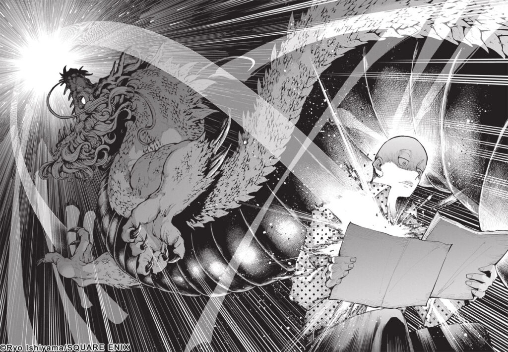 De son nom japonais Ryû to Cameleon, le titre a débuté au Japon en 2022 chez Square Enix, dans le mensuel Gangan Joker (Les mémoires de Vanités, Secret Service, Gambling School,…) et compte pour le moment 7 tomes au Japon. Il est signée par Ryô Ishiyama, un quasi-débutant pour la France, même s’il en est un peu différemment au Japon : il a été temporairement assistant d’Eiichirô Oda et s’est occupé de la composition des storyboards de One Piece – Épisode A (cf couverture ci-dessous), le spin-off dessiné par Boichi, paru en 2020 au Japon. Il a aussi été assistant de Kôhei Horikoshi sur My Hero Academia.