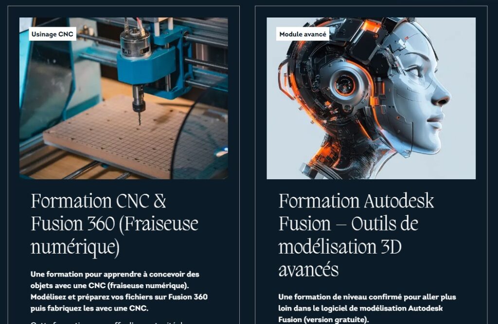 La Biche-Renard c’est un centre de formation en Conception et Fabrication Assistée par Ordinateur (CAO/FAO). Plus concrètement, nous proposons des formations à la modélisation 3D, à l’impression 3D (fabrication additive) et à l’usinage numérique (CNC – fabrication soustractive). Et bien entendu, nous sommes à l’écoute de nos élèves donc nous travaillons en continu pour faire évoluer nos formations et/ou en proposer de nouvelles, donc pas de chose à venir encore cette année.
