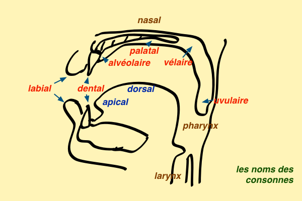 Mais avant d’aller plus loin, il semble nécessaire de définir les termes suivants afin une meilleure compréhension de la phonologie du japonais : alvéolaire, battu, fricative, latéral, uvulaire ou voisé. Pour commencer voici un schéma des différents lieux articulatoires