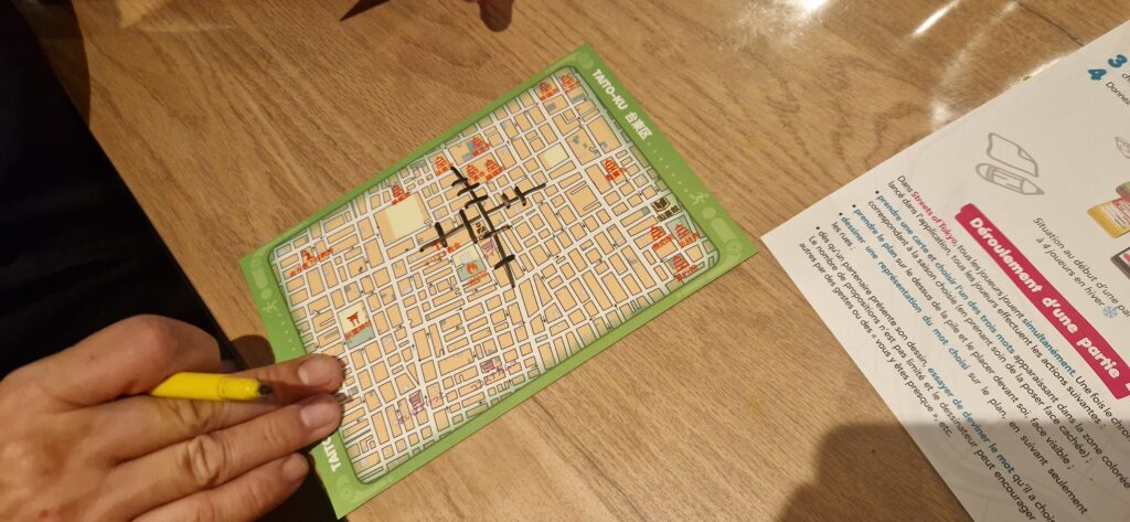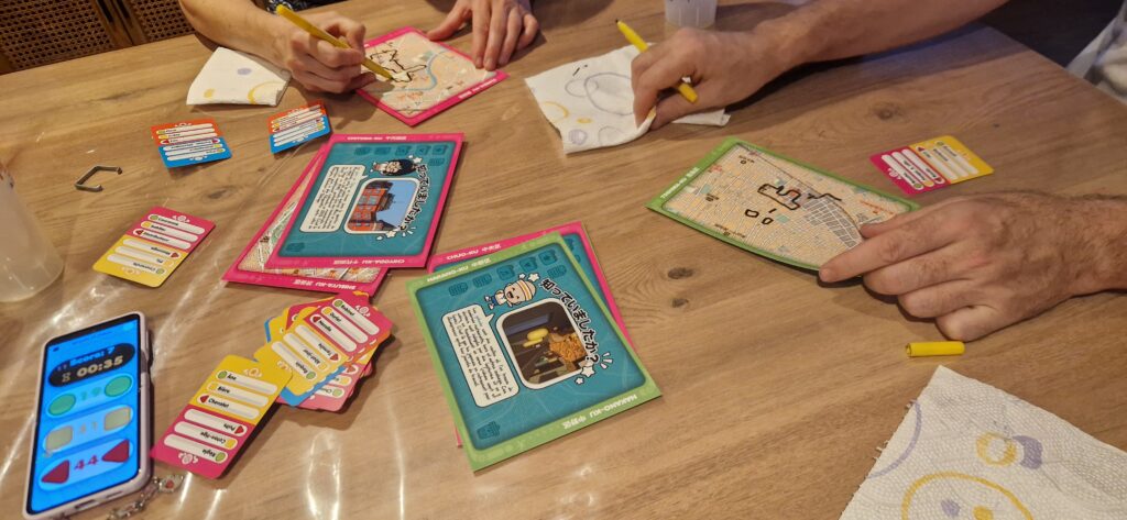 Une fois cette difficulté maitrisée, le jeu réussit tout ce qu’on aime d’un jeu de dessin : nous faire rire ! Les parties s’enchaînent et on ne voit pas le temps passer. Indiquées à environ 20 minutes, les durées des parties sont finalement plus aléatoires. Tout dépend de la capacité de chacun à faire deviner, et à deviner à son tour. Les 3 minutes du chrono de départ peuvent très vites filer dans certains cas. Et le petit plus très appréciable : chaque plan de Tokyo trouve à son verso une petite description de son quartier, une approche très ludique et appréciée pour les enfants.