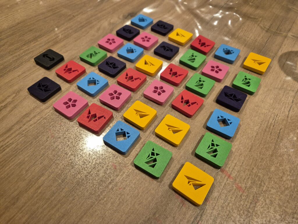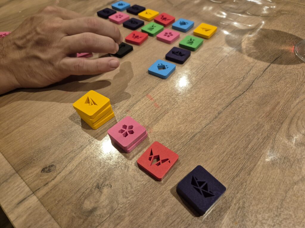 La mécanique de Coloro est extrêmement simple : à son tour de jeu, le joueur actif récolte une tuile au choix, soit en ligne soit en colonne, en fonction de la tuile Flèche. Lorsqu’il choisit une tuile origami, il la remplace par la tuile Flèche qu’il pivote de 90°, la faisant ainsi changer de sens. Concrètement, les joueurs récoltent toujours dans le même sens : en colonne pour l’un, et en ligne pour l’autre. Tout dépendra du sens choisis par le premier joueur (le plus jeune !). La partie s’arrête dès lors qu’aucun mouvement n’est plus possible. On passe alors au décompte : soit l’un des deux joueurs prend la majorité sur une famille, soit il y a égalité. Dans ce cas-là, c’est celui qui a la pile la plus à gauche la plus grande qui remporte la victoire. Attention donc au placement de vos familles !