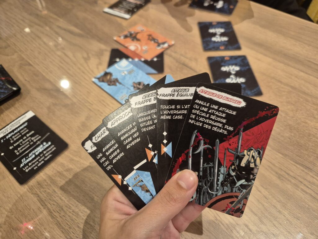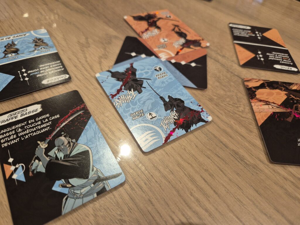 Deux possibilités s’offrent alors : c’est une carte déplacement, elle est jouée en priorité, et elle permet au samouraï de se déplacer sur la piste ; ou c’est une carte attaque qui cherche à infliger des blessures à son adversaire. Pour que l’attaque soit réussie, les conditions inscrites sur la carte doivent être respectées (être sur la même case que son adversaire, n’être qu’à une carte d’écart de son adversaire, ou être 2 cartes plus loin de lui). Si l’adversaire est touchée une première fois, il retourne sa carte samouraï. Si c’est la deuxième fois, il meurt. Après avoir résolu les cartes, chaque joueur défausse sa première carte jouée et récupère dans sa main la seconde.