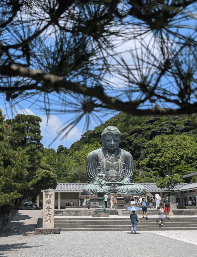 Après un court trajet en bus, on arpente les allées qui conduisent au pied du Grand Bouddha (Daibutsu) dont la masse de près de 93 tonnes frappe par sa sérénité. C’est, rappelons le, le deuxième plus grand Bouddha du Japon, derrière celui du Tôdai-ji à Nara.