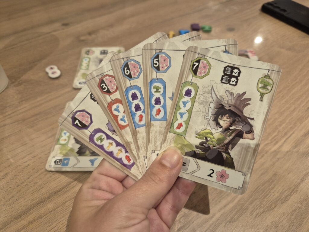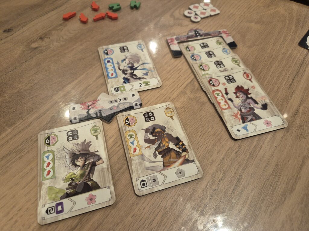 Pour se faire, le jeu repose sur un système mélangeant draft, placement et gestion de ressources. La partie débute avec 5 cartes en main. Ces cartes sont des artisans, répartis en 5 types : les origamistes, les botanistes, les forgeronnes, les sculpteurs et les artificières. Ils peuvent être utilisés de deux manières différentes : soit ils rejoignent le village et deviennent ainsi des résidents, soit ils sont défaussés et deviennent ainsi des fabricants. Lorsqu’ils deviennent fabricants, ils permettent de récolter une ressource de leur type (un katana pour une forgeronne, une statuette pour un sculpteur, etc.) ; et lorsqu’ils deviennent résidents, ils permettent d’obtenir un pouvoir permanent ainsi qu’un objectif d’offrande.
