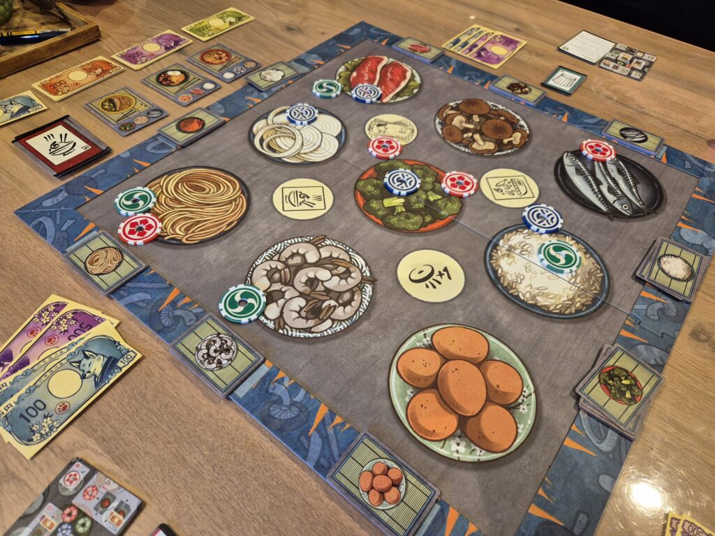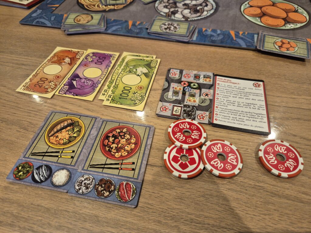Maintenant que vous avez les bases, entrons un peu plus dans le détail : chaque jeton possède une valeur, de 100 à 600 yens. Ces valeurs vont avoir une importance lorsqu’ils tombent sur un ingrédient ou sur le bonus « Pourboire. » Sur un ingrédient, ils indiquent le prix à payer pour l’obtenir. Et ce n’est pas que son propre jeton qui compte, mais les jetons de tous les joueurs ! Exemple : sur l’ingrédient « Nouilles », il y a un jeton rouge de 100 yens et un jeton vert de 600 yens, il faudra alors payer 700 yens pour obtenir une carte Nouilles. Pour le pourboire, c’est un peu différent, car on ne compte ici que son propre jeton en multipliant par 3 sa valeur. Ainsi, un jeton 600 yens sur une case Pourboire permet d’obtenir 1800 yens.