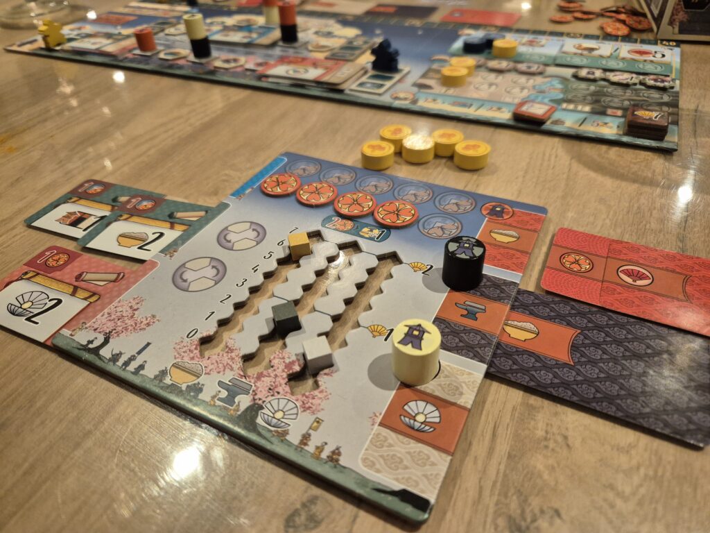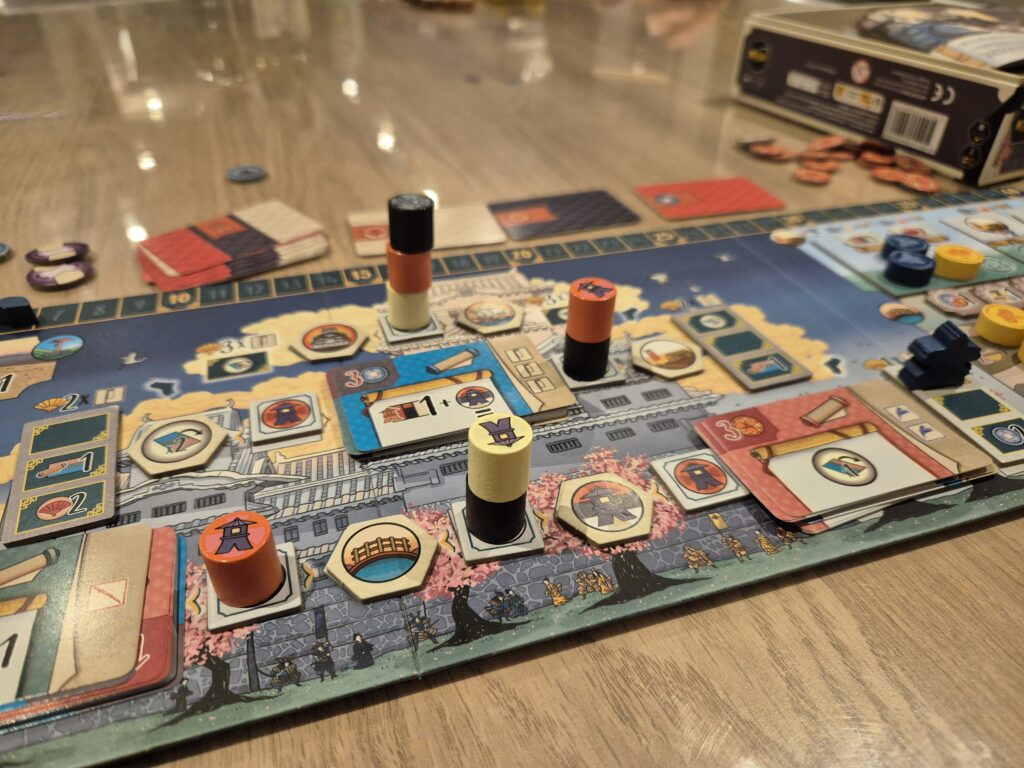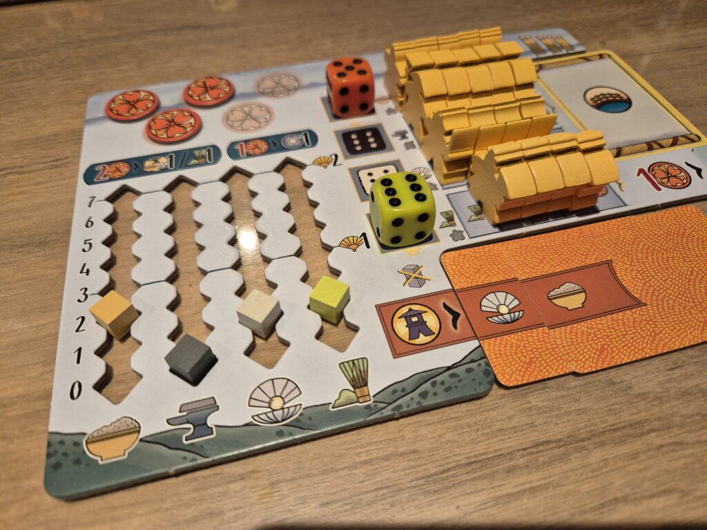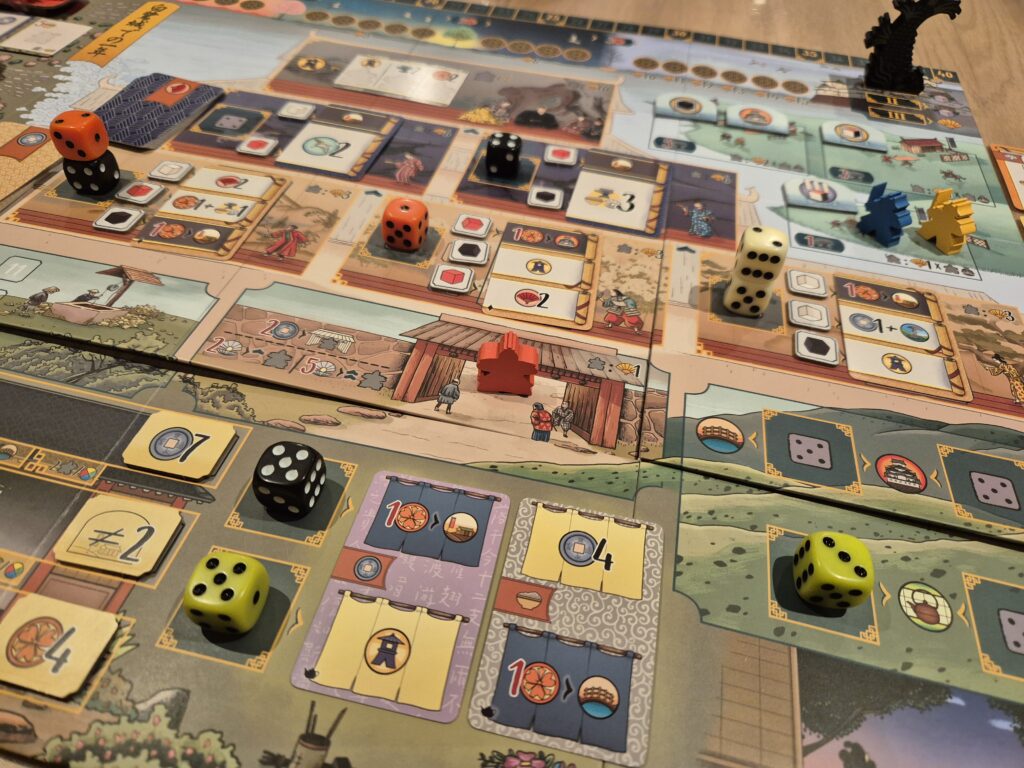 Le jeu se joue en 3 manches similaires : on lance un ensemble de plusieurs dés de couleur (rouge, blanc et noir pour le jeu de base, auxquels on rajoute des dés verts avec l’extension) que l’on vient placer sur de petits ponts des mêmes couleurs. Ces dés sont pour tous les joueurs, puisque tour à tour, chacun va en choisir un et le placer sur le plateau central. L’emplacement choisi peut déclencher plusieurs éléments : le paiement ou l’obtention d’argent, la récolte de ressources ou de points daimyo, ou encore la possibilité de réaliser certaines actions (à condition que l’on ait les ressources nécessaires pour !). En plus du plateau central, chaque joueur dispose de son propre plateau personnel où l’on peut également placer des jetons pour récolter des ressources.