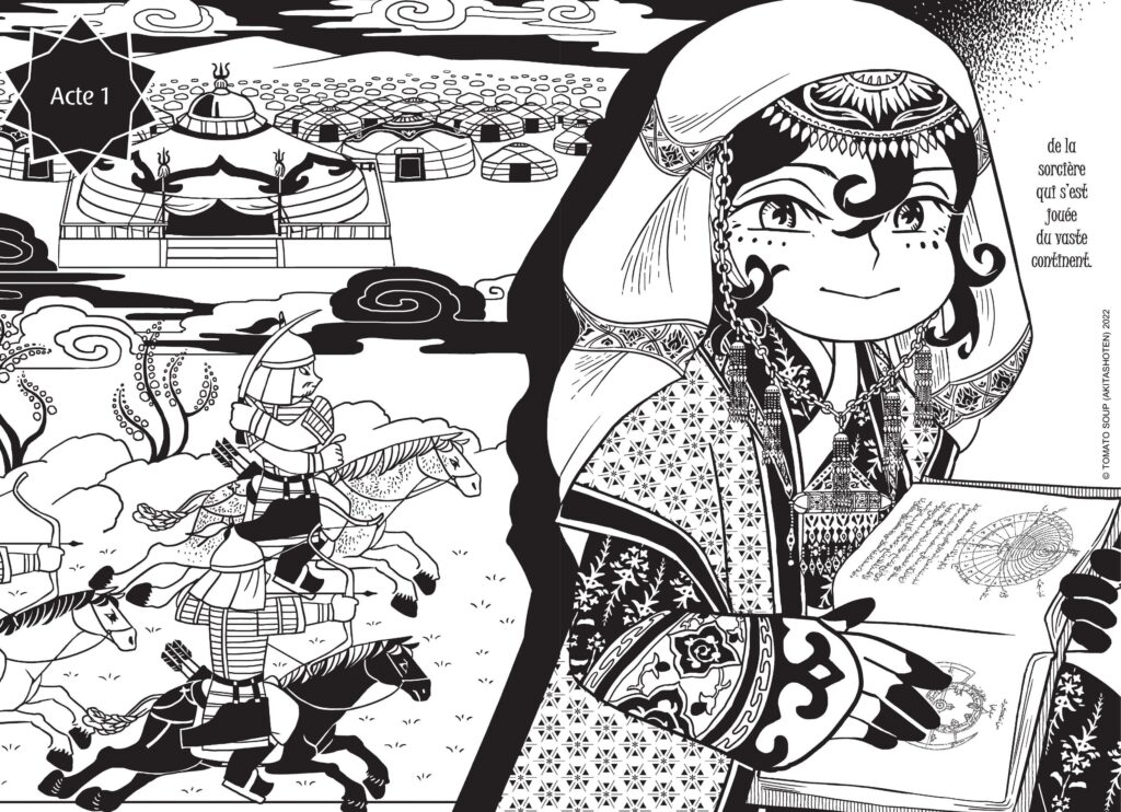 Que ce soit au cinéma, dans les séries ou même dans la littérature, l’Empire mongol a très souvent, pour ne pas dire constamment, été fantasmé. Mais dans son manga, Tomato Soup semble avoir fait le choix de nous le dépeindre autrement et de le présenter dans toute sa complexité. Car oui, si l’Empire mongol a été si puissant, il a aussi été victime de divisions internes, d’intrigues de succession, de tensions religieuses, etc. La place des femmes dans le pouvoir ainsi que la science en tant qu’arme idéologique y sont même fortement abordées.