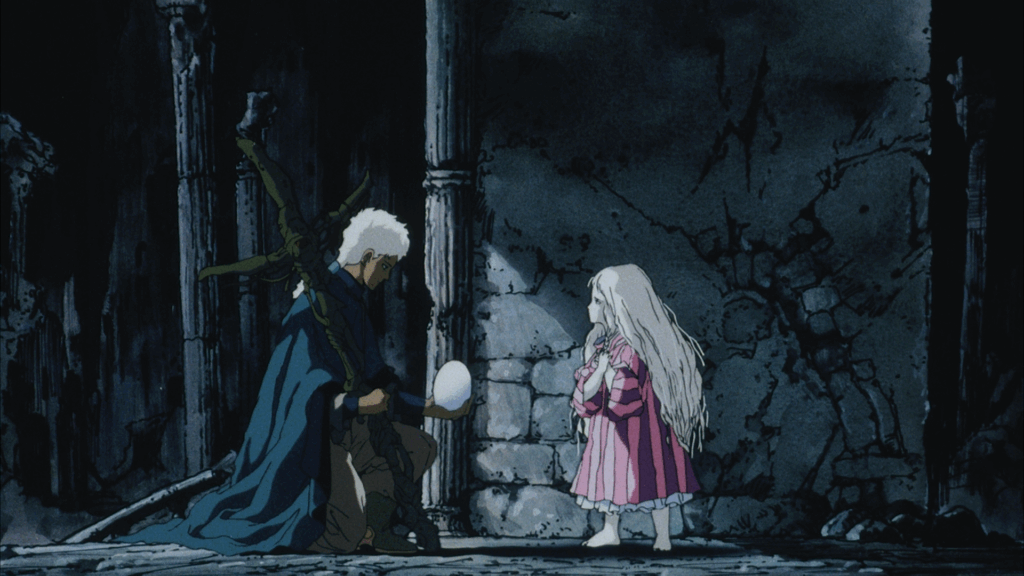Pour un film jugé cryptique et difficile d’accès, L’Œuf de l’ange est assez simple dans son exposition. Dans un monde en ruines, une fillette anonyme rencontre un jeune homme anonyme. Elle porte un œuf, lui une croix. Les mains bandées du second ne laissent presque aucun doute quant à son identité, et la manière dont Oshii filme la première évoque parfois Marie Madeleine. Quant au monde qu’ils habitent, il est divisé, de ce que l’on en voit, en trois espaces : une grotte, une ville, et, entre les deux, une forêt. Si Oshii ne s’embarrasse pas de détails dans son intrigue ni d’une armée de personnages secondaires, c’est parce qu’il sait que la force de son film est ailleurs. Dans son univers auquel, malgré la ruine, il apporte un soin tout particulier, et dans sa portée symbolique.