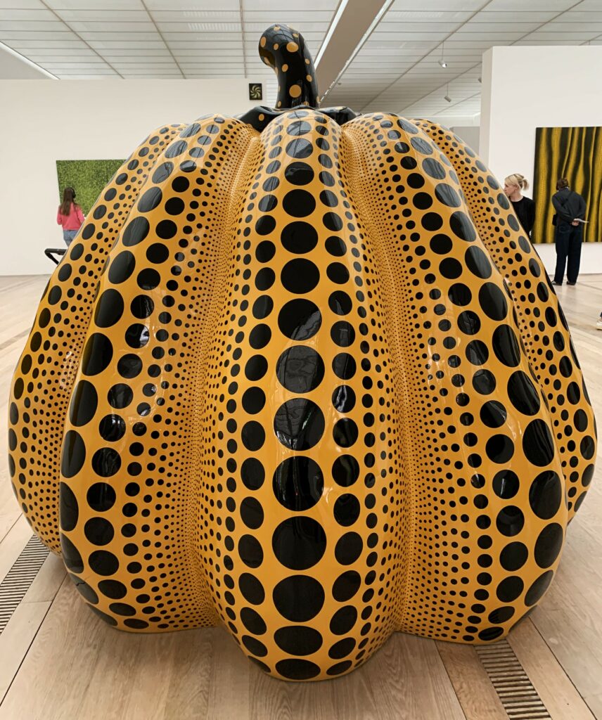 L’exposition ne se contente pas de montrer des œuvres : elle propose une expérience multisensorielle intéressante. Au cœur de l’exposition, une « Infinity Mirror Room » transporte les visiteurs dans un univers où miroirs, lumières et motifs se démultiplient à l’infini. La file d’attente pour y accéder est impressionnante en fin de semaine ! Dans cet espace clos, le spectateur devient partie intégrante de l’œuvre. Il perd ses repères spatiaux et temporels, happé par une illusion d’immensité. Mais d’autres pièces emblématiques captent l’attention, comme la citrouille géante, sculpture monumentale recouverte de pois noirs sur fond jaune. Elle est un symbole de réconfort et de connexion entre la terre et le cosmos. Chaque salle de l’exposition devient alors une expérience, où l’art se vit et transforme la perception du réel.