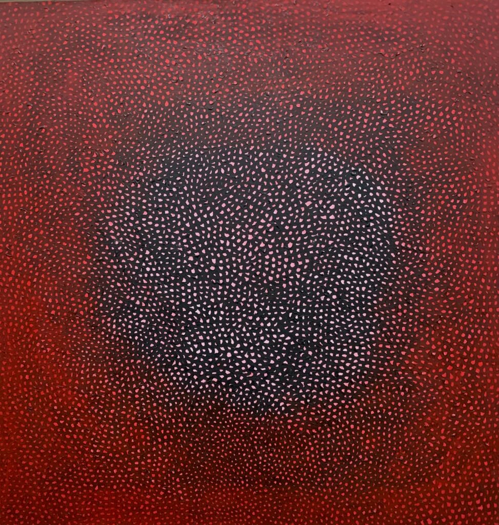 Les filets (ou « Infinity Nets ») sont peut-être l’élément le plus emblématique de son exploration de l’infini. Ces toiles créent une illusion d’espace sans limites, comme une invitation à se perdre dans une dimension parallèle. L’artiste y voit une représentation de l’univers : un réseau infini de connexions, où chaque point est à la fois unique et indissociable du tout.