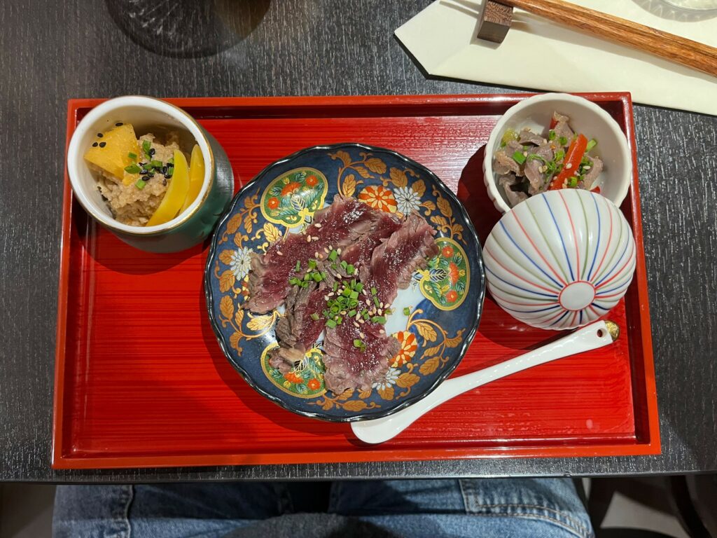 Le repas s’ouvre par un plateau avec 3 entrées japonaises. Les contenants sont aussi mignons que le contenu est bon. Des gésiers avec un assaisonnement pimenté, un tataki de bavette, et de l’okara (marc de tofu) et kaki. C’est exquis et l’on commence à se dire qu’on est à la bonne adresse.