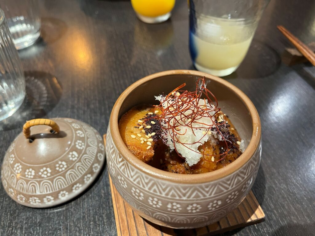 Puis, le plat intermédiaire arrive. Nous découvrons le ganmo. Fait maison à partir de tofu, d’igname, de pâte de tapioca et de gingembre. Il est fondant (トロトロ) à l’intérieur, juste frit et croquant (サクサク) à l’extérieur, accompagné d’un délicieux dashi au kombu.