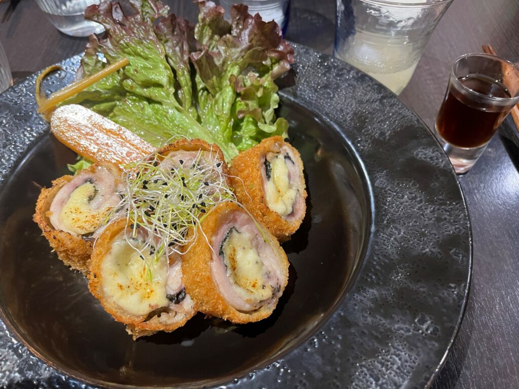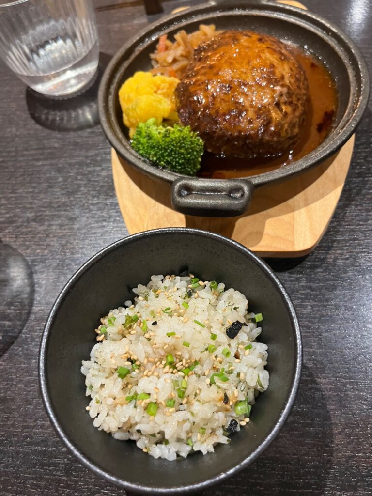 Vient le plat…repéré sur internet et tant attendu. Une belle assiette de cordon bleu inspiré du Japon est apportée avec son ponzu maison et une petite coupelle de riz surmonté d’un assaisonnement maison à base de champignons. C’est délicieux et l’assiette est très généreuse. Tout comme la portion de fromage à l’intérieur qui est le seul petit bémol – très personnel- , n’étant pas une « fondue » de fromage cuit. Notre binôme a opté pour un Bochi Bochi hambagu. C’est très joliment servi avec des légumes et le chef Masa verse sur la viande la sauce maison toute chaude. Contrairement à la sauce habituelle type sauce américaine plutôt lourde, c’est une sauce demi-glace qui s’apparente plus à un jus dont les saveurs viennent réveiller le plat.