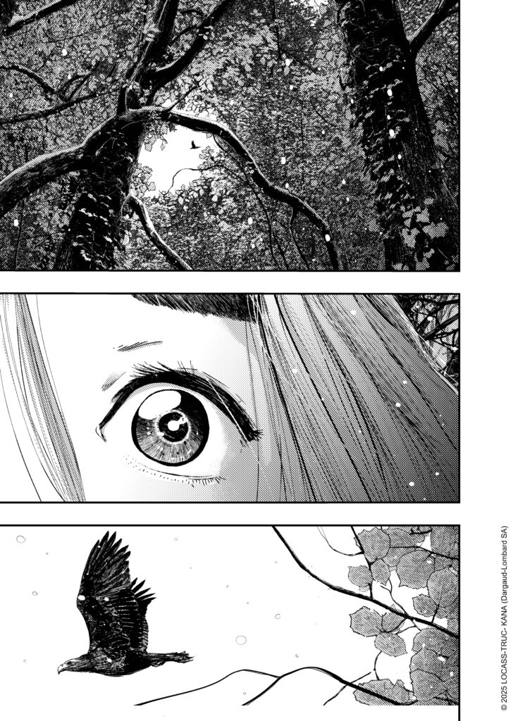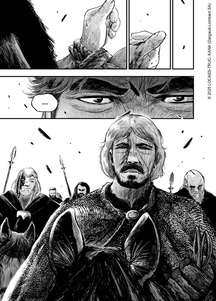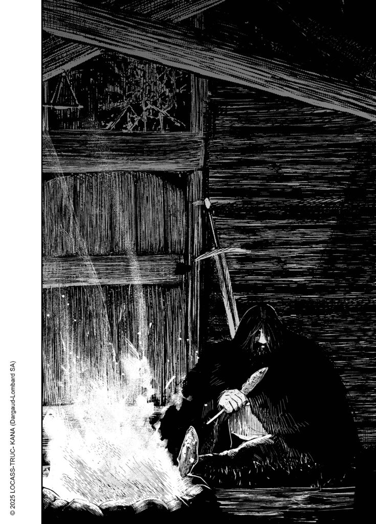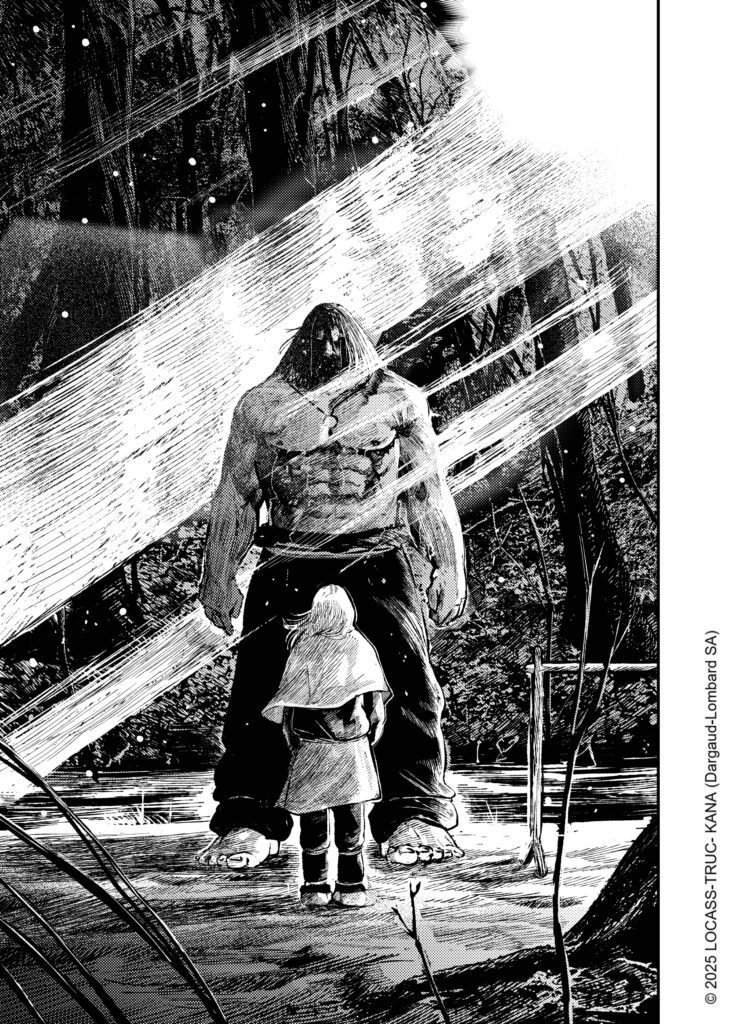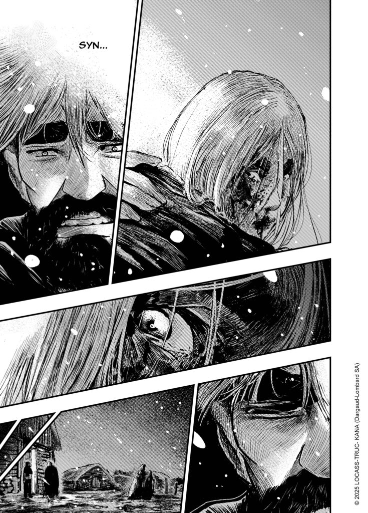 Ce n’était pas une intention de départ, mais au fil de l’écriture j’ai commencé à m’attacher à cette jeune fille, au point d’en faire un personnage central. L’idée d’une jeune fille muette au milieu d’une meute de guerriers vikings et de villageois immoraux, à qui elle donnerait une leçon de dignité et de courage, m’a semblé particulièrement intéressante. À la fois dans ce que ça peut symboliser de nos jours, mais aussi d’un point de vue graphique, avec le défi pour Locass de donner corps, courage, force, dignité à ce personnage muet. Notamment par ses regards.