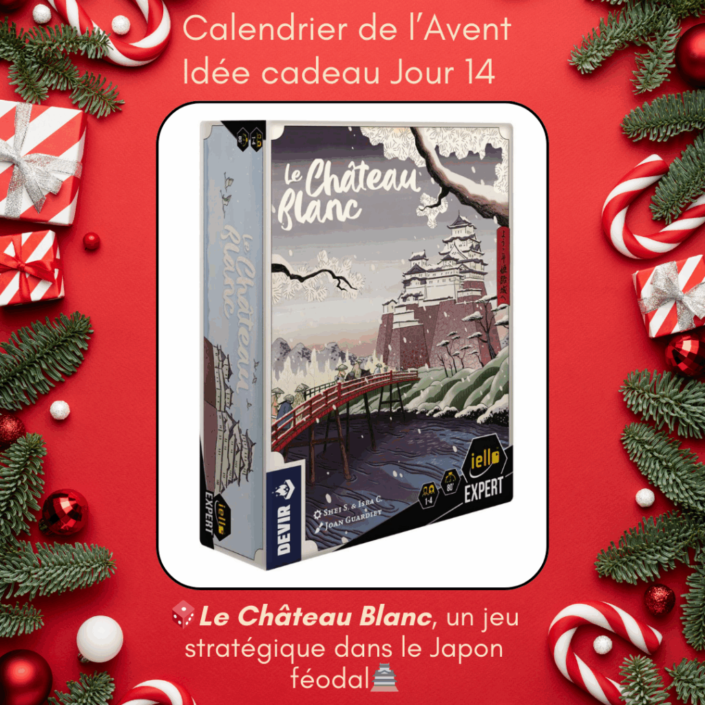 Pour les joueurs de jeu de société, l’éditeur Iello propose dans sa gamme Expert Le Château blanc (2023) dont l’esthétique soignée de l’artiste Joan Guardiet évoque les estampes japonaises Ukiyo-e de l’époque d’Edo. Derrière ce paysage enneigé de carte postale, au pied du château d’Himeji, se joue un duel politique et stratégique où chaque joueur (1 à 4) cherche à amener son clan vers la victoire en récoltant le plus de points de victoire. Pour l’emporter sur les autres clans, il faudra maîtriser le placement de chacun de ses membres, assimiler les mécaniques de gestion des ressources, de placement d’ouvriers et de dés pour réaliser des actions. Les multiples possibilités promettent d’intenses parties de réflexion, surtout en ajoutant l’extension de jeu Matcha qui intègre une nouvelle dynamique.