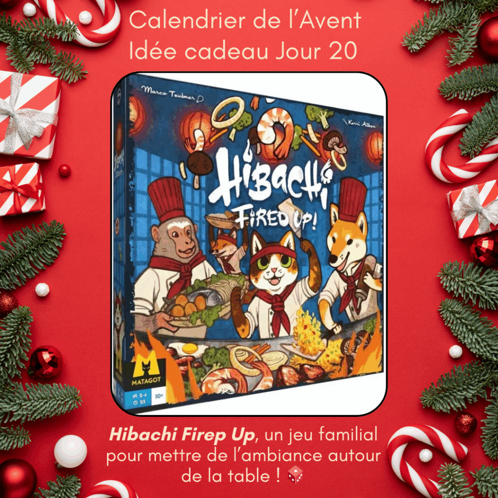 Les vacances de Noël réunissent toute la famille et pourquoi ne pas s’essayer à Hibachi: Fired Up!, un jeu de société familial qui promet des parties enflammées ? Chaque joueur incarne un chef cuisinier en compétition avec d’autres pointures du milieu. Pour gagner, il faut être le premier à réaliser 3 recettes. En lançant des jetons, le joueur peut acheter des ingrédients ou gagner des bonus, voire récupérer ou vendre du chili. Attention à ne pas cramer tous vos yens ! Ce système d’ingrédients à acheter pour réaliser les recettes rend le jeu accessible au plus grand nombre pour jouer en famille et entre amis.