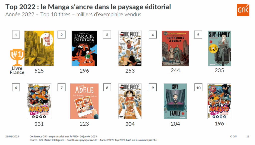 Le manga, lui, réussi même à progresser, à la marge : +2 % et 48 millions de manga vendus, soit 57 % des ventes de BD en volume (et 41 % en valeur seulement, vu que les mangas sont moins chers que les BD classiques). Après avoir doublé en deux ans, l’arrêt est tout de même assez net. Néanmoins le manga est l’un des rares segments qui progresse encore puisque la BD de genre recule de 8 % en volume et la BD jeunesse (la catégorie d’Astérix, cité plus haut) chute de 13 %. À force de progresser, le manga se pose sur le sommet d’une impressionnante montagne : en 10 ans, le manga a vu son volume de ventes multiplié par 4 ! Alors qu’aucun manga n’apparaissait parmi les 100 livres les plus vendus en 2019, ils étaient trois en 2020, 24 en 2021 et 28 en 2022. Dans le top 10 des ventes de BD du panéliste GfK pour 2022, on en trouve 6 :