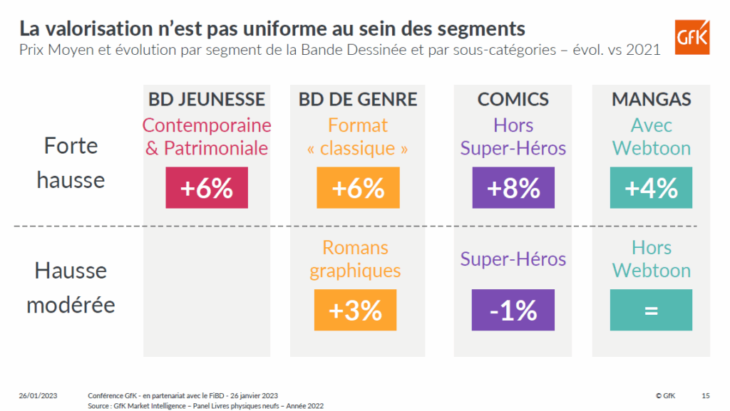 Le prix de la pâte à papier a déjà bondi de 40 à 50 % en 2020-2021, de 600 à 850 euros la tonne en Europe environ, face à la demande accrue d’impression et un basculement écologique de fond du plastique vers le papier. La seconde augmentation en 2022 a emmené la pâte à papier à prêt de 1200 euros la tonne. Pour faire simple, de 2020 à 2022 le prix de cette matière première a doublé. Si pour un manga, 40 à 50 % du prix de l’imprimeur dépend de ce papier et que l’impression représente entre 6 et 10 % du prix final d’un manga, on peut estimer que l’augmentation du cout du papier de 2020 à 2022 entraine un surcout du manga entre 3 et 4 %. Bon, ce calcul à la louche se place dans le cas où l’imprimeur répercute tous ces couts sur la facture à l’éditeur et que ce dernier fait de même avec le manga qu’il vend. Ce qui n’est sans doute pas le cas car, selon le bilan 2022 de GfK sur la bande dessinée, le manga, vis à vis des autres bandes dessinées, connait en effet une hausse modérée, et qu’il faut décortiquer pour bien la comprendre :