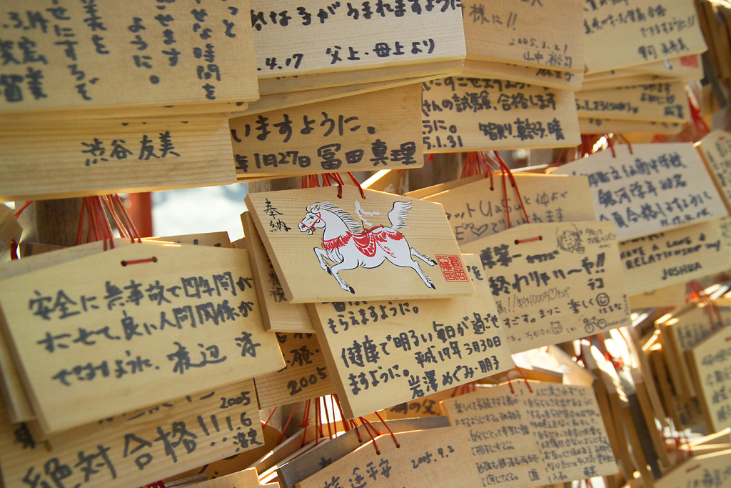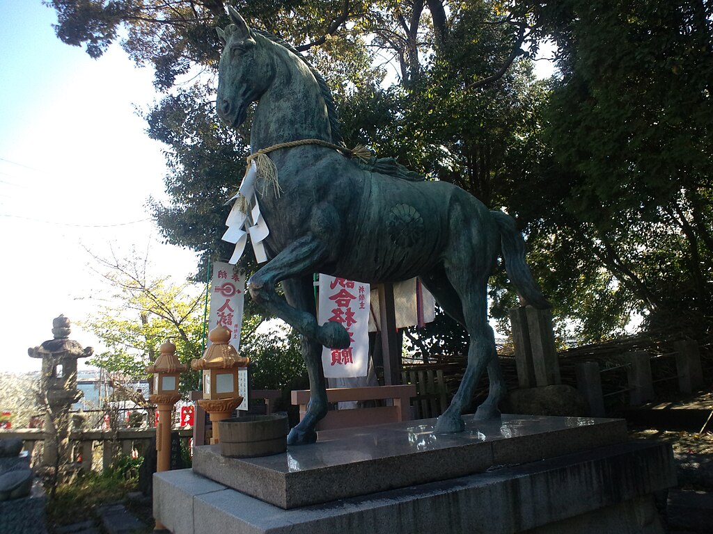 Dans les sanctuaires shintô, il n’est pas rare de voir des représentations d’animaux et le cheval a une place de choix car dans la religion autochtone, l’animal est la monture sacrée des kami, divinités indigènes de l’archipel nippon. Durant l’époque de Nara (710-794), selon la tradition du shinme (神馬 « cheval sacré »), des chevaux étaient offerts aux sanctuaires en guise d’offrandes votives pour obtenir des dieux la pluie ou le beau temps.