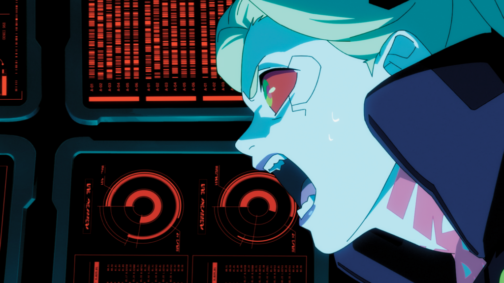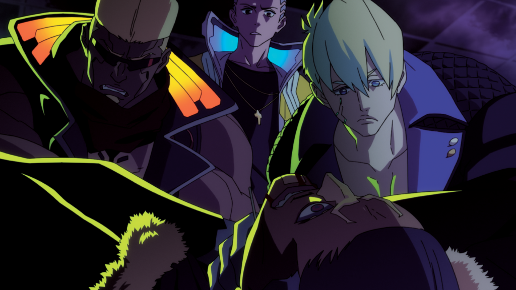 La narration est à l’os, sans une once de gras, mais fait confiance au spectateur pour saisir les dynamiques relationnelles en jeu au sein du groupe de personnages principaux : le gang d’edgerunners mené par Maine, le leader charismatique surgonflé aux prothèses cybernétiques, et auquel se joint David. En effet, malgré le temps imparti qui ne permet pas forcément de développer le parcours des différents membres de cette troupe comme ils l’auraient mérité (notamment Rebecca), ces personnages sont brossés avec efficacité et surtout, sans la moindre condescendance de la part du réalisateur, David en tête. Un regard, une réflexion, un ton de voix suffisent pour comprendre les liens qui se tissent entre eux.