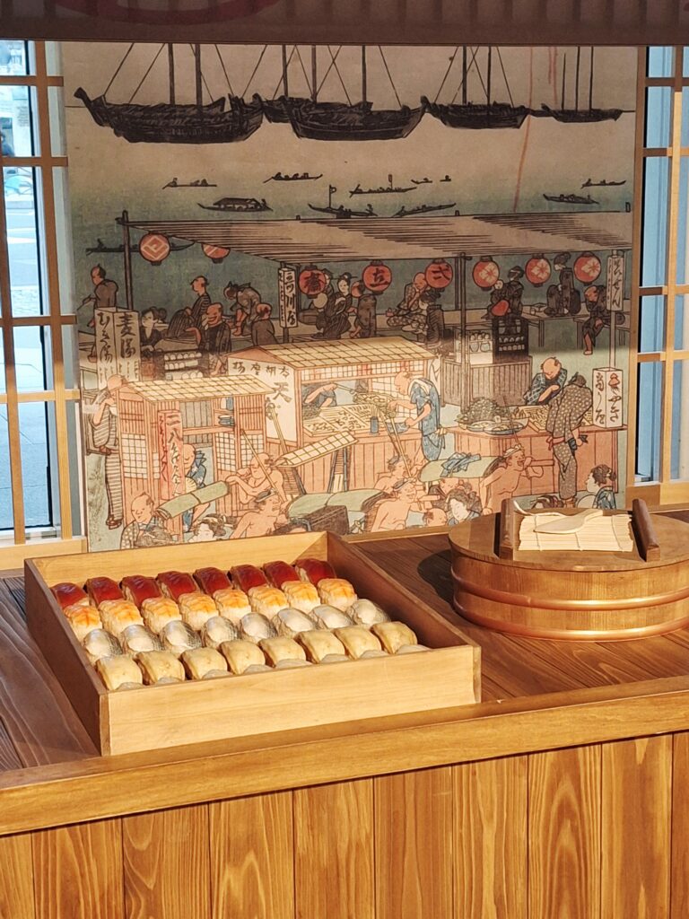 Les échoppes de sushis se multiplient et font fureur à Edo. Les clients dégustent généralement debout, face au maître sushi, les variétés de leur choix préparées à l’avance. L’akami de thon, le chinchard (aji), l’alose (kohada), la palourde rouge (akagai) et autres coquillages (torigai) ont la cote à cette époque. Les nigiri-zushi sont rapides à manger et bon marché, à partir de 4 mon la pièce soit 120 yens (moins de 0,70€ actuellement). De plus, de prestigieux restaurants de sushis ouvrent au même moment que les échoppes plus populaires qui sont à la portée de toutes les bourses.