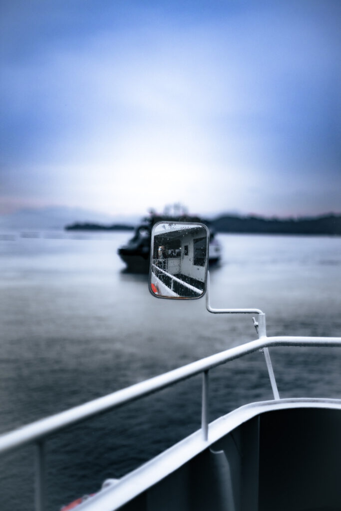 Nul n’ignore qu’au Japon, la pluie peut arriver très vite. En quelques minutes, le décor change. Les mégalopoles se transforment en un univers de film dystopique et les lieux plus reculés comme Miyajima, quant à eux, prennent une dimension plus mystique inspirant l’imaginaire de Ghibli. Franchissez le pas, armé du célèbre parapluie transparent des konbini, pour découvrir cette nouvelle version du Japon. Le dépaysement commence dès le ferry depuis Miyajimaguchi. Le plus tôt possible, pour profiter du peu de touristes à bord. Avec le JR pass (régional et national), le trajet est gratuit depuis Hiroshima, seulement une taxe de 100 yens est demandée avant de monter sur le ferry de la compagnie JR. À bord, surtout des locaux. Le trajet dure environ 10 minutes et le bateau accoste sur une île encore endormie.