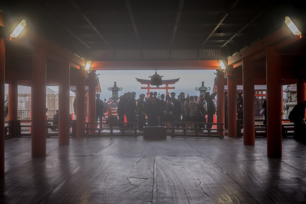 C’est dans ces moments-là que le caractère de l’île prend tout son sens : les feuilles d’érable entre les gouttes sur le parapluie, les cerfs de l’île cherchant un abri sous les pontons rouge vermillon, la baie qui abrite le torii s’effaçant dans la brume et laissant le portail entre ce monde et celui des esprits comme suspendu… La nature reprend ses droits sur l’agitation touristique. Les cérémonies se poursuivent dans le calme, le son de la pluie remplace celui de la foule.