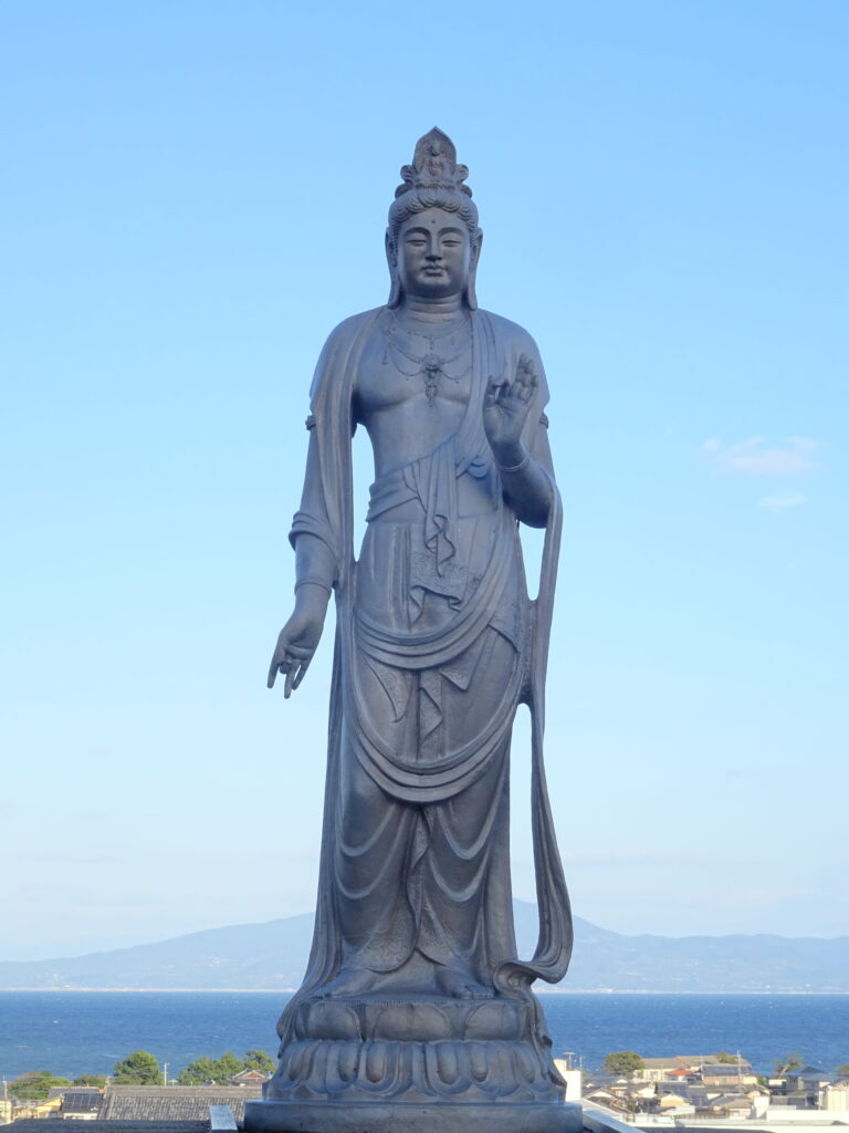 On l’aperçoit de loin, dès la sortie est de la gare de Nagasaki. Une main levée vers le ciel, l’autre abaissée vers la terre, la silhouette gris argent d’une statue de Kannon émerge à mi-corps des toits, des passerelles métalliques se croisant au-dessus de la voie express. Au bout de quelques rues en escaliers montant vers la colline Heifuri, elle apparaît soudain tout entière, par-delà le porche de ciment portant une inscription en chinois, en une vision proprement fantasmagorique.